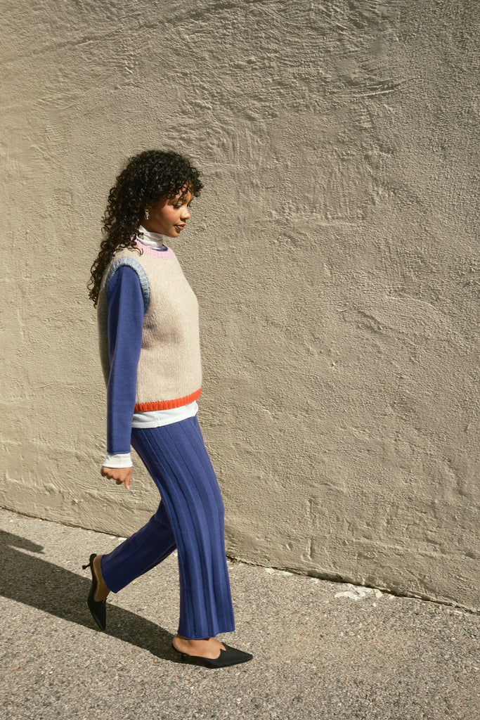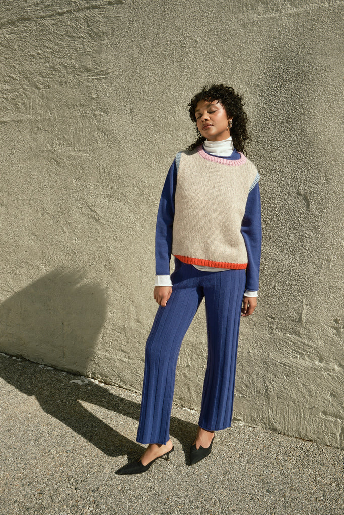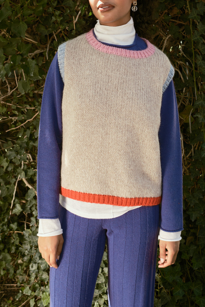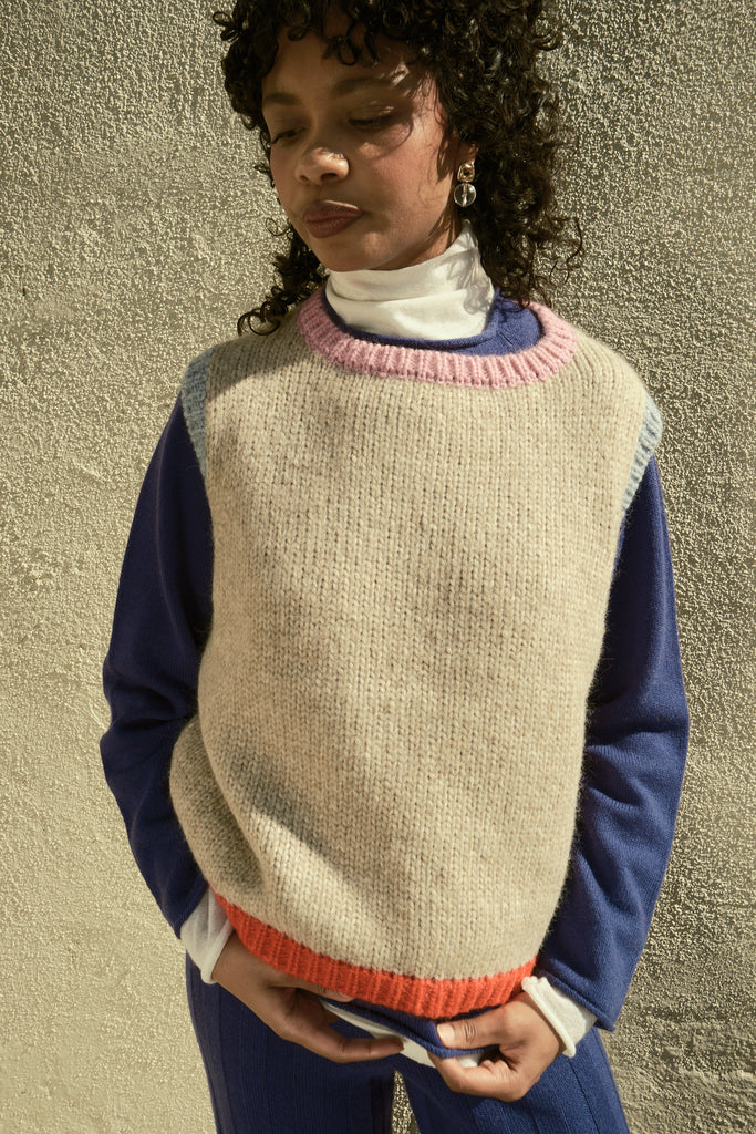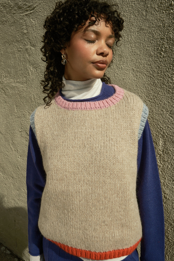The chunky, slightly fuzzy Sabine Vest serves major grandma vibes in today’s modern color palette. Its relaxed, boxy fit makes it ideal for layering in the chilly months.