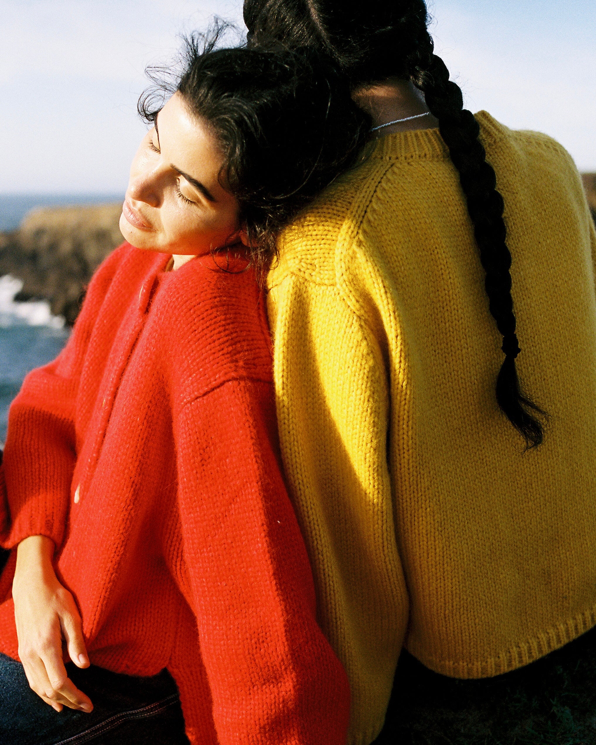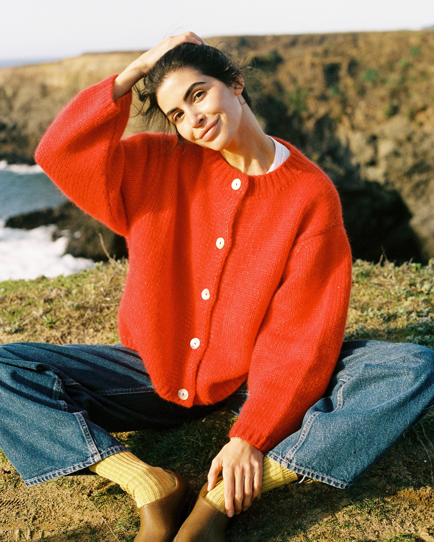 The chunky, slightly fuzzy Sheba Cardigan Sweater serves major grandma vibes in today’s modern color palette. Its relaxed, boxy fit makes it ideal for layering in the chilly months. Retro-inspired bracelet sleeve length for a slightly cropped sleeve.