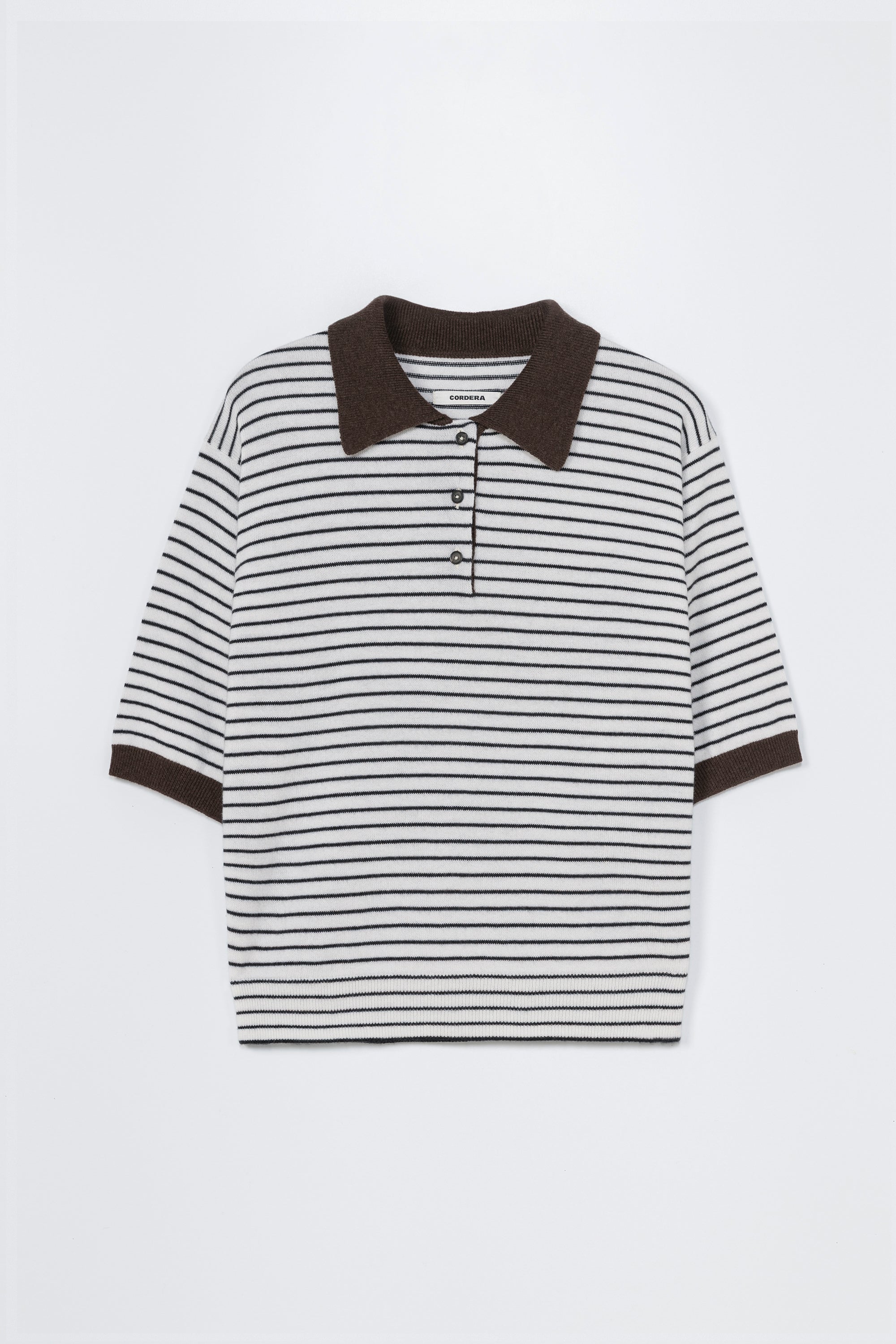 This striped polo features a classic regular fit and elbow-length sleeves, making it a versatile piece for transitional weather. Designed in black and white stripes, it stands out with contrasting brown accents on the polo collar and cuffs. It includes a three button placket and ribbed finishes at the hem and cuffs for a clean silhouette. An easy-to-style essential that brings a refined twist to a timeless pattern.