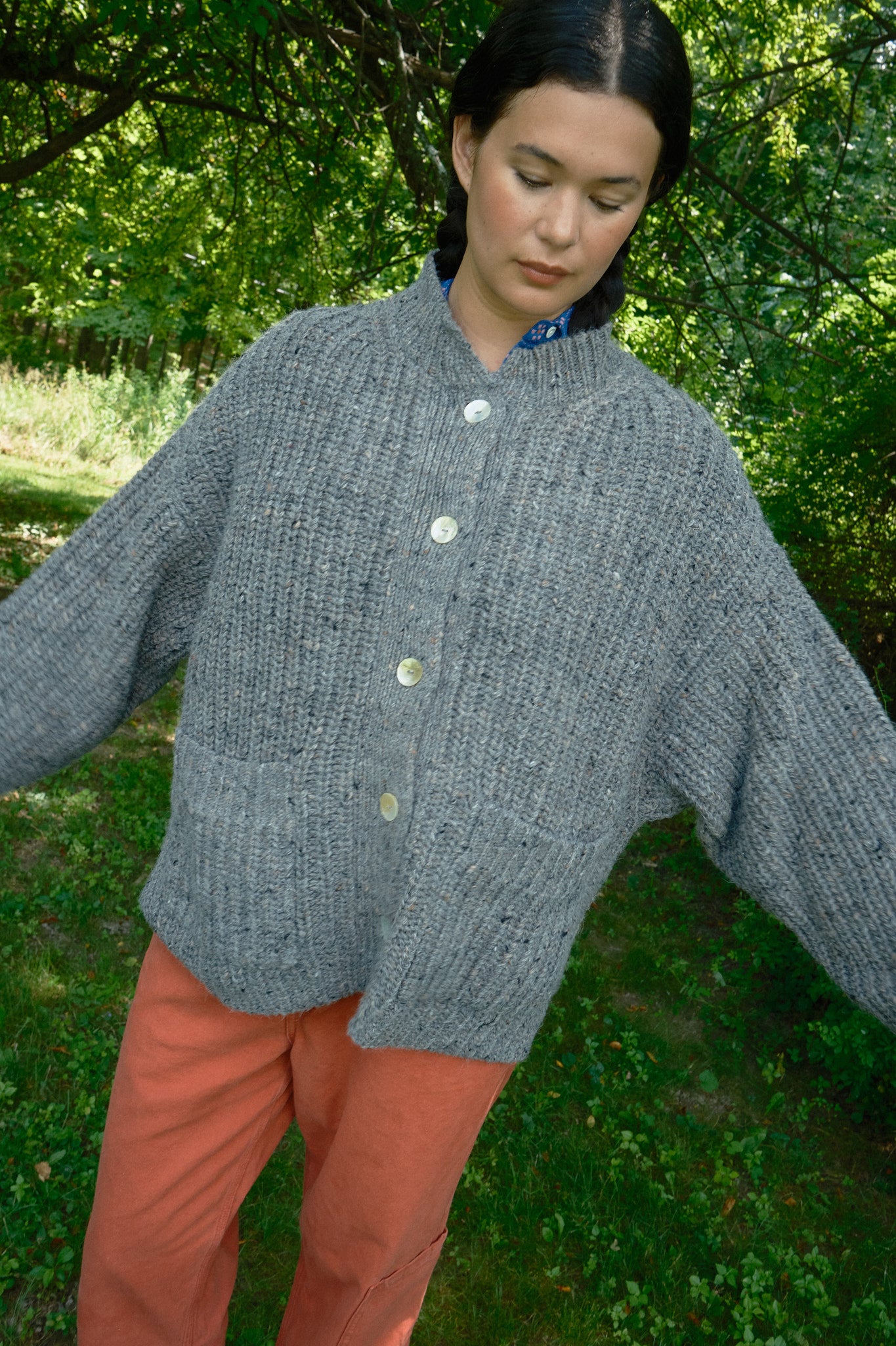 The Sybil Ribbed Cardigan is a big chunky blanket of a sweater, featuring oversized pockets (good for snacks) and our favorite shiny pearly buttons.