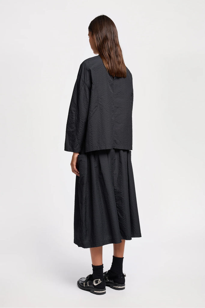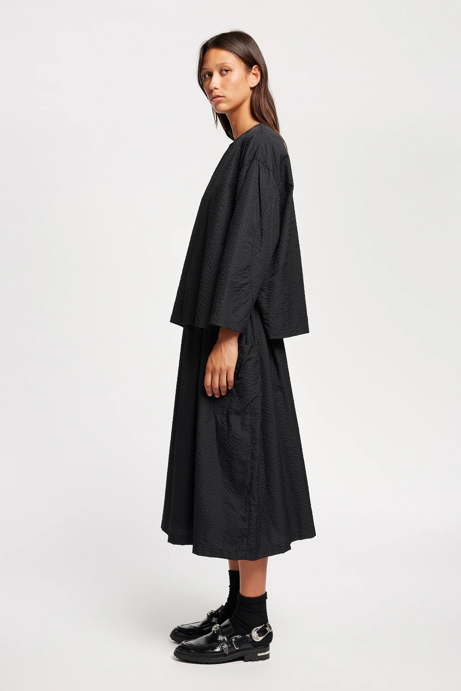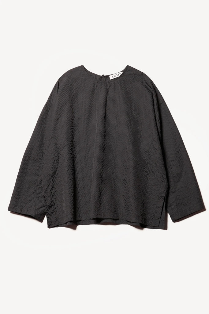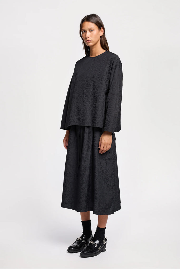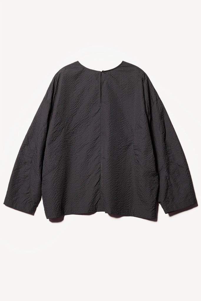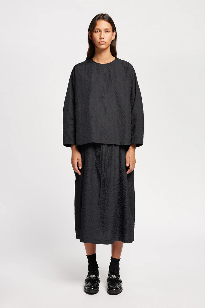 Crafted from a Japanese nylon seersucker with a soft hand feel and lightweight structure, this top offers texture and ease in equal measure. Designed with a relaxed fit, it features dropped sleeves and a clean round neckline for an effortlessly modern silhouette. A straight hem with subtle side splits completes the minimalist look while adding quiet movement. The textural elements brings understated interest to this versatile piece—perfect for elevated everyday wear or dressing up for an evening out.