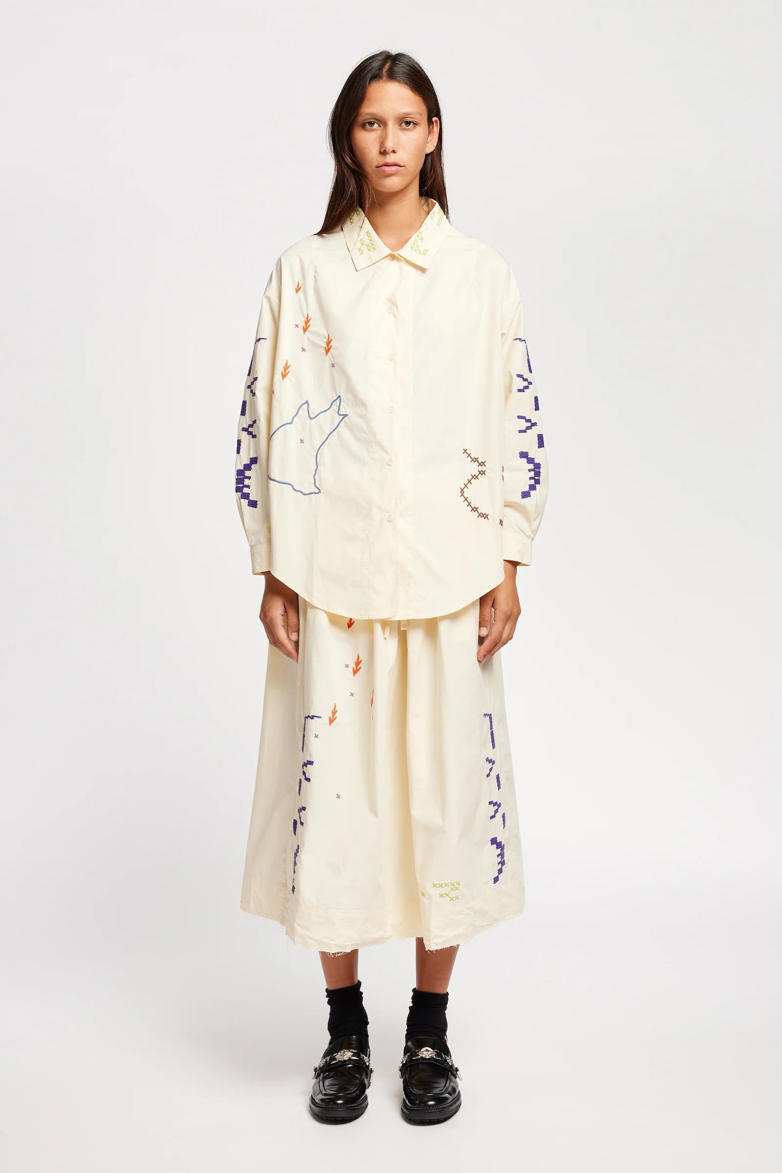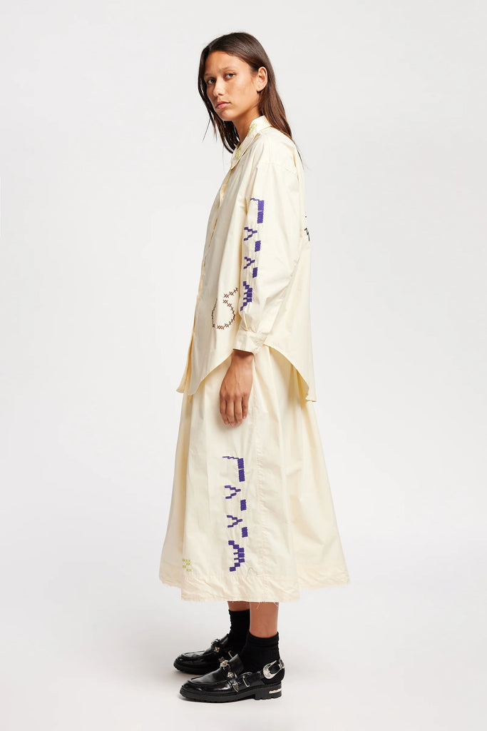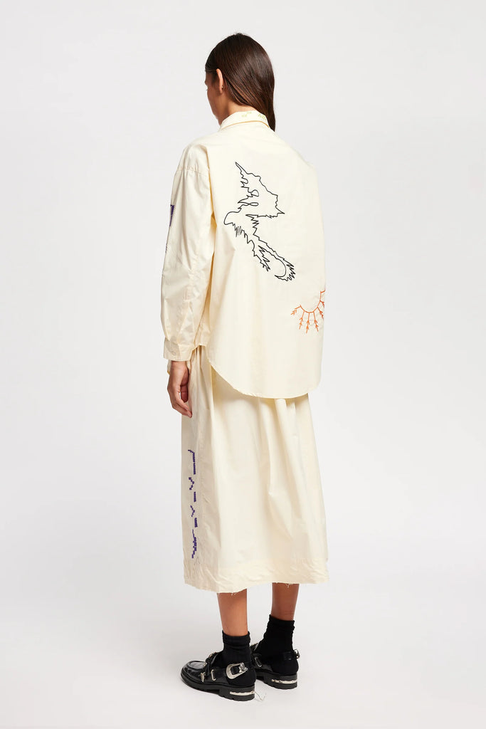 A statement skirt featuring clean lines and contemporary proportions detailed with intricate embroidered motifs derived from the Arecibo message. The motifs are placed at the front and back of the skirt. The motifs are a wearable interpretation of humanity’s dialogue with the natural world. The silhouette falls to a midi length with subtle gather details falling from the elastic waistband, finished with side seam pockets.