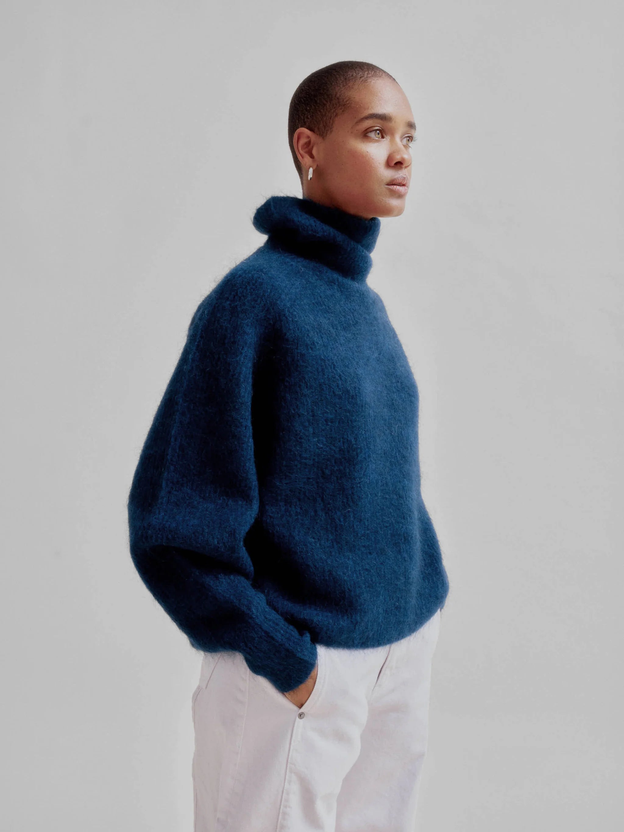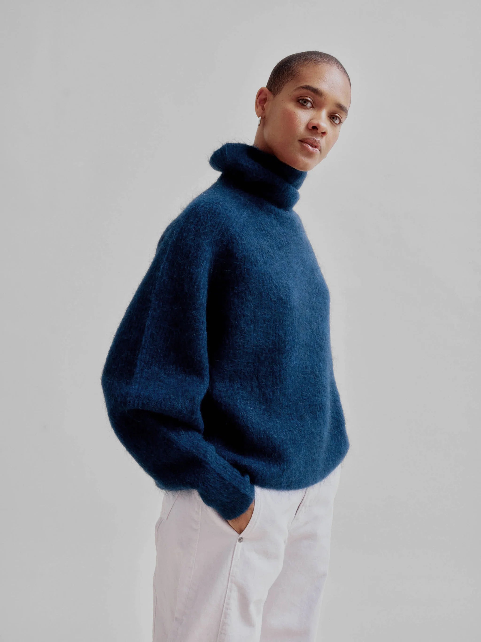 The signature high-neck from SAYAKA DAVIS’s mohair series. Featuring sculpted, curved sleeves and a generous collar as standout details. The absence of a seam at the front makes it easy to wear and reduces any tightness around the neck. The collar can be folded over or left standing, creating a balanced and versatile look. This season, the length has been shortened to provide a more modern and versatile fit, making it easier to pair with this season's bottoms.