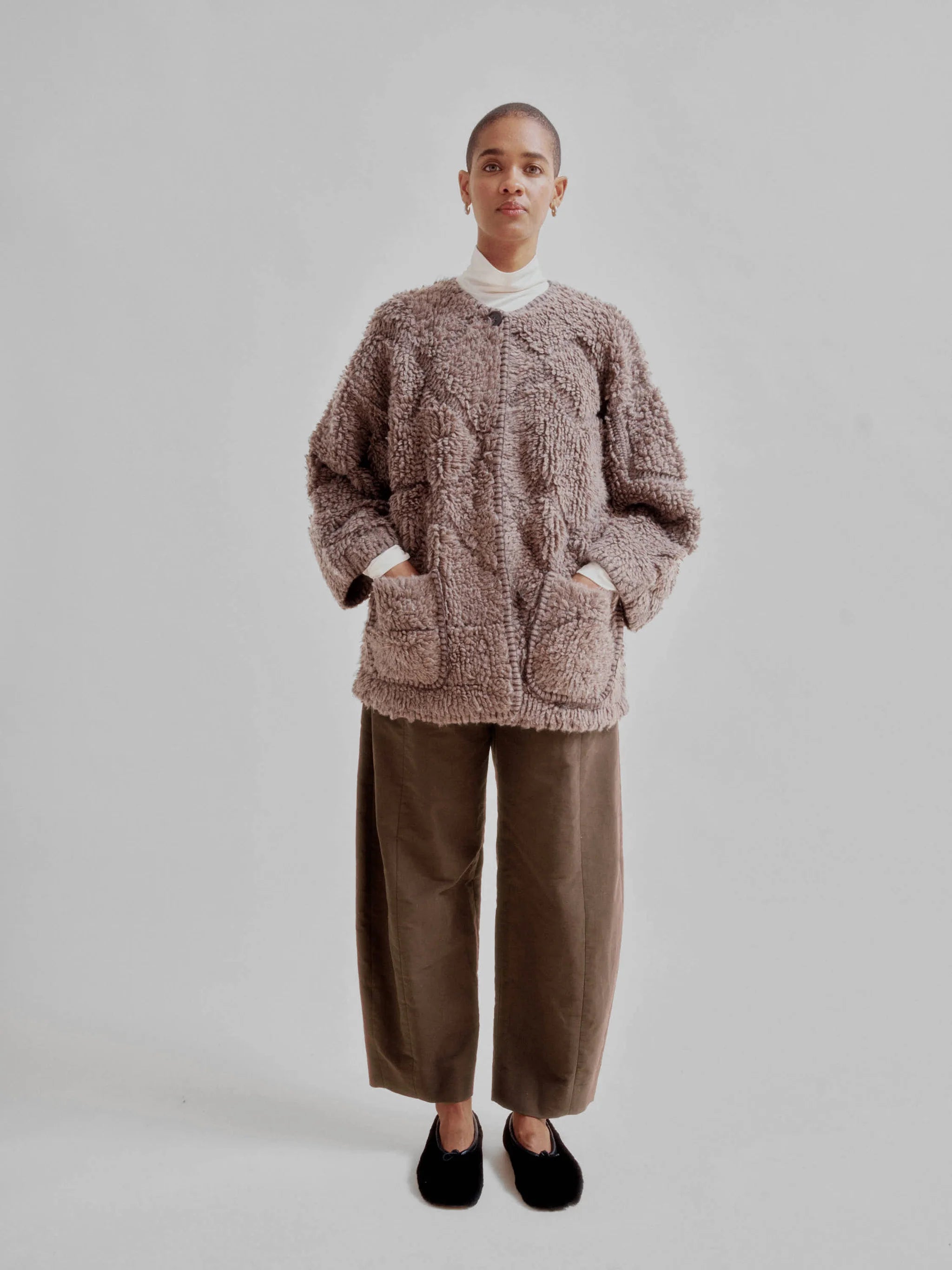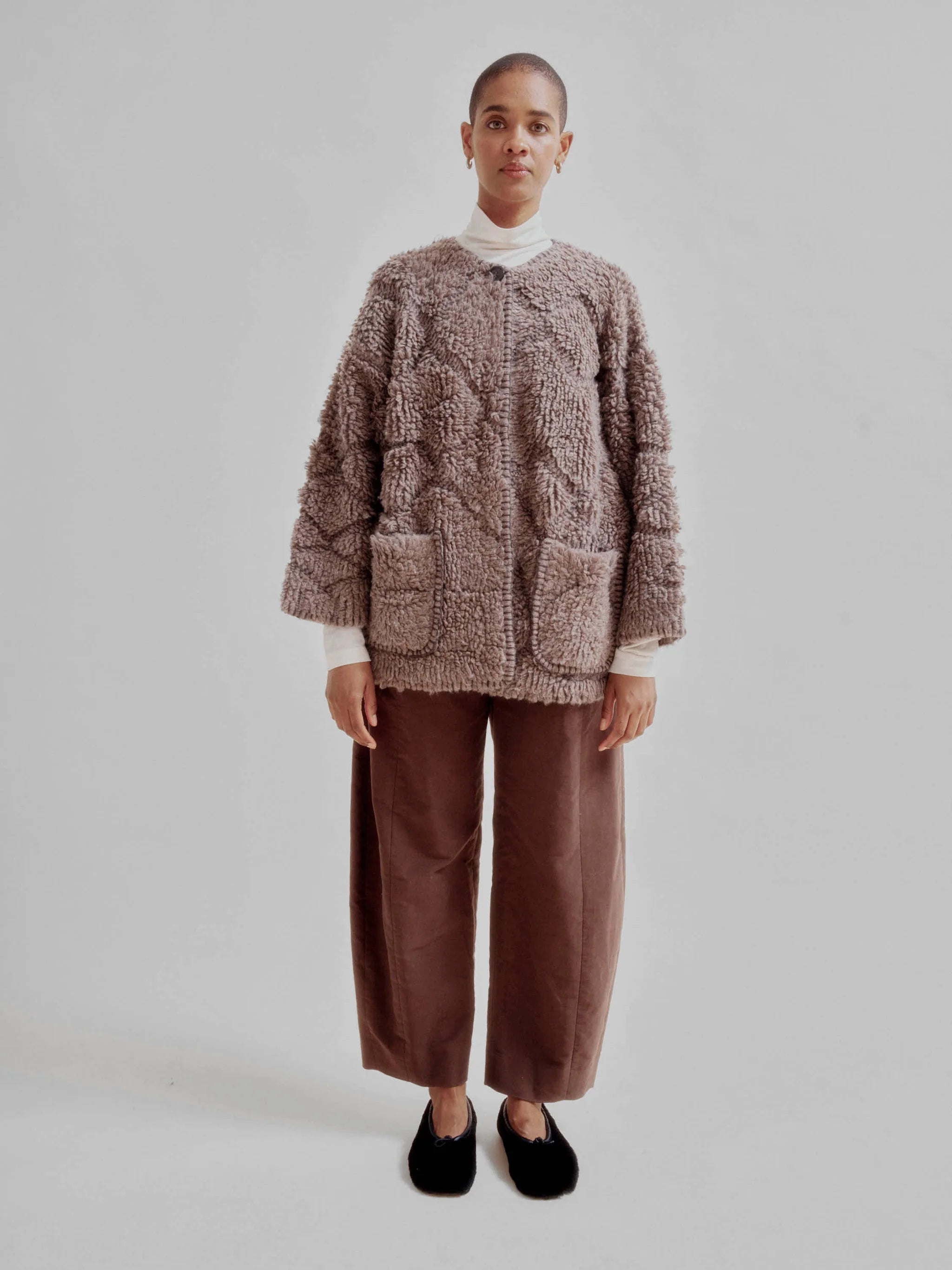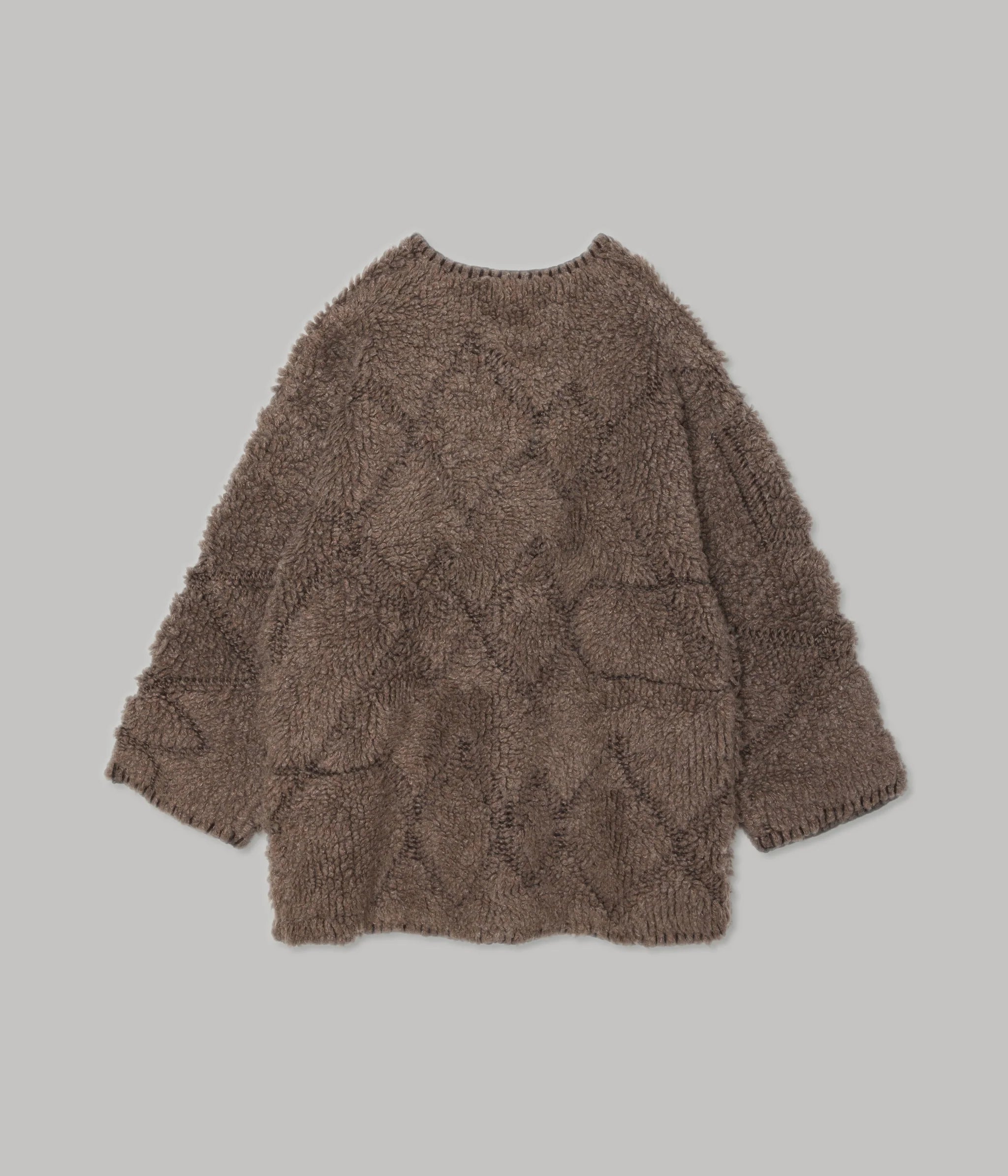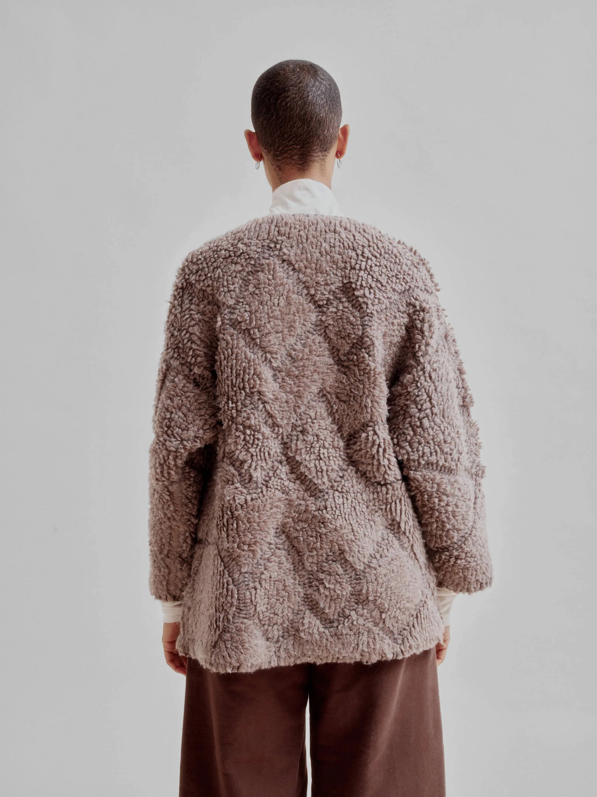 A pile-knit jacket featuring a two-tone Moroccan bebi-inspired jacquard pattern. The edges are finished with color-contrast hand blanket stitching, adding a subtle accent. This outerwear serves as a stylish statement piece, perfect for pairing with denim or skirts.