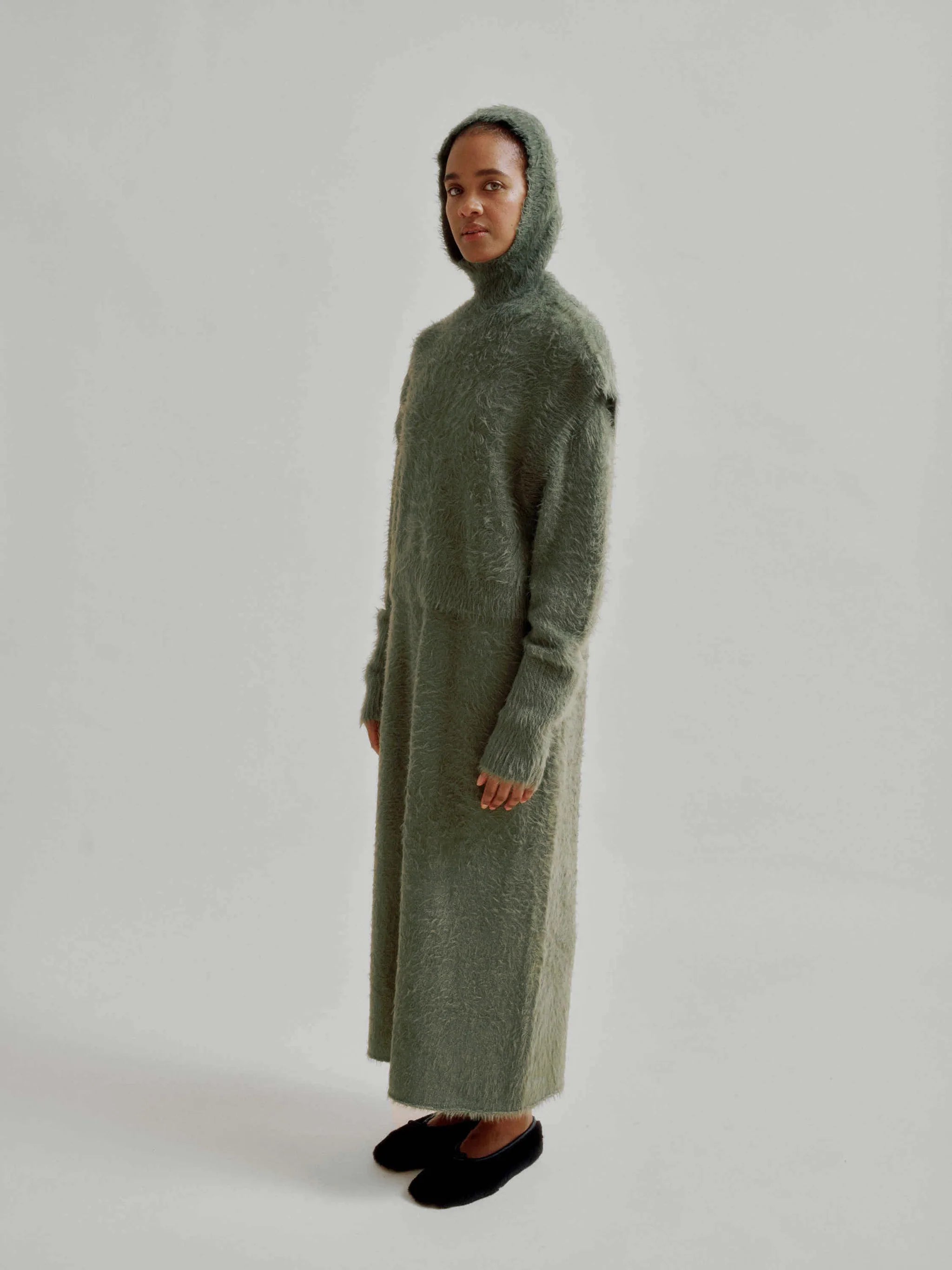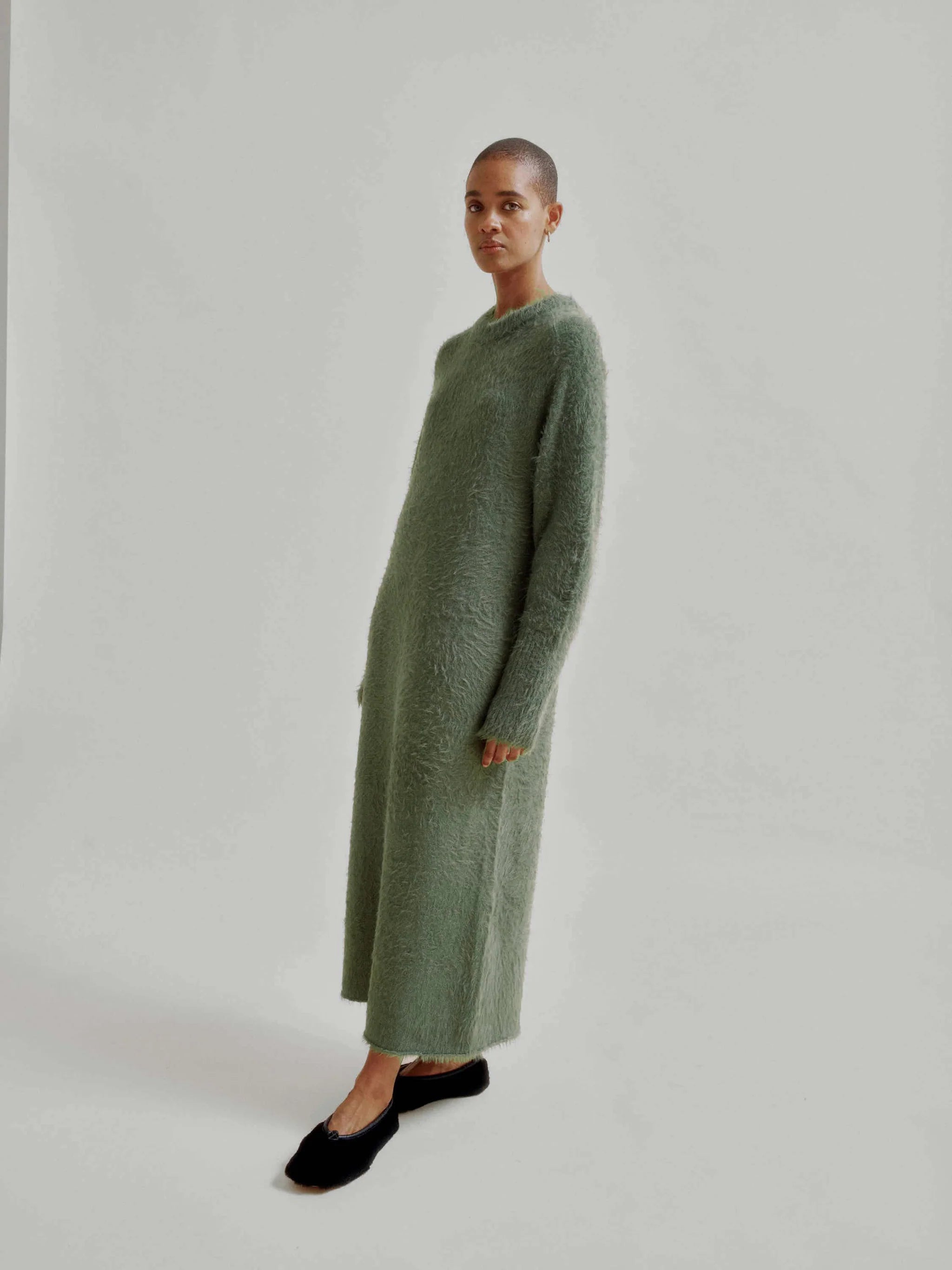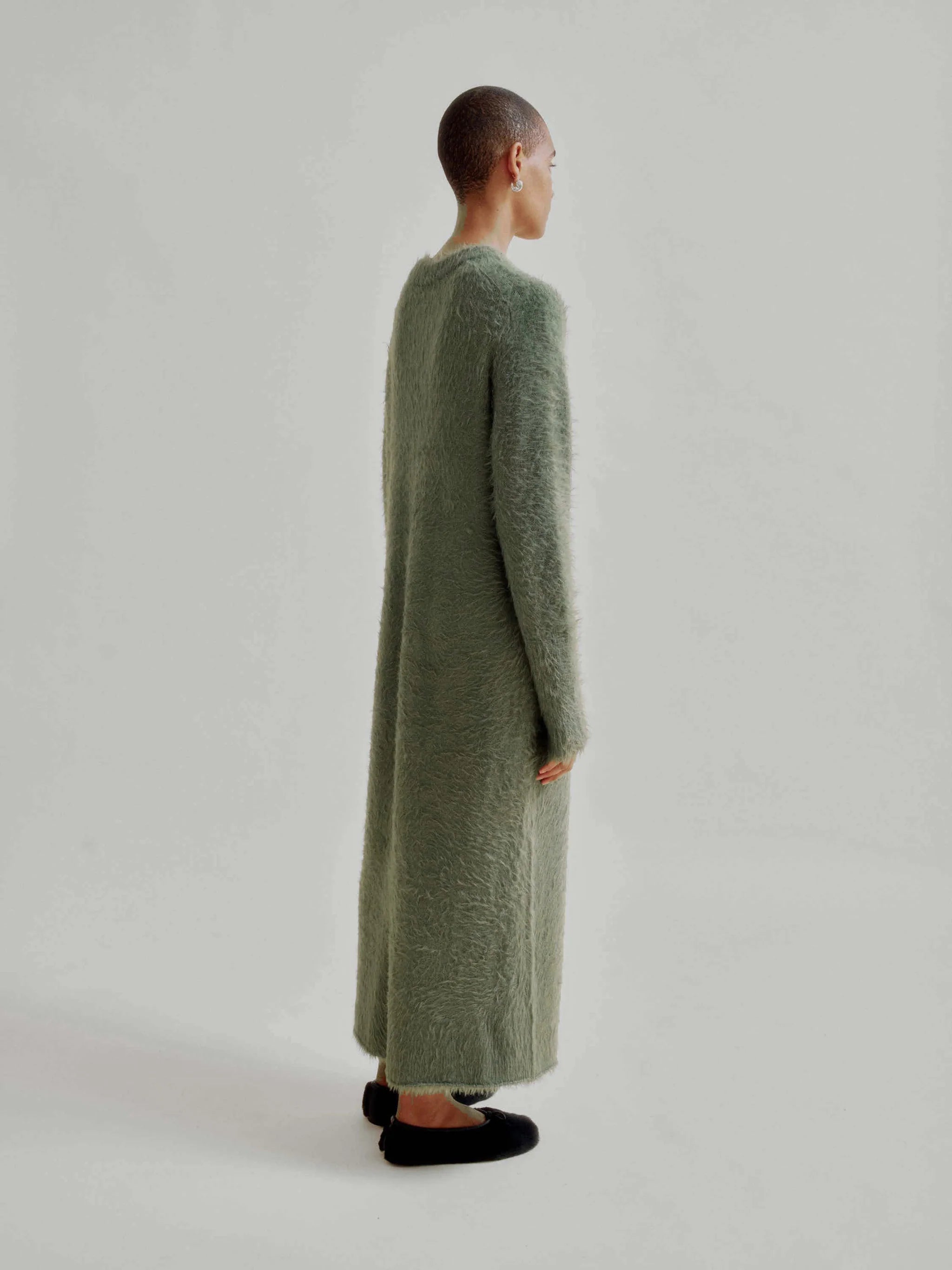 A shaggy yarn knit dress with long cuffs as a standout detail. The back hem features a slit for ease of movement. This piece adds a touch of elegance, making it perfect for both casual occasions and parties.