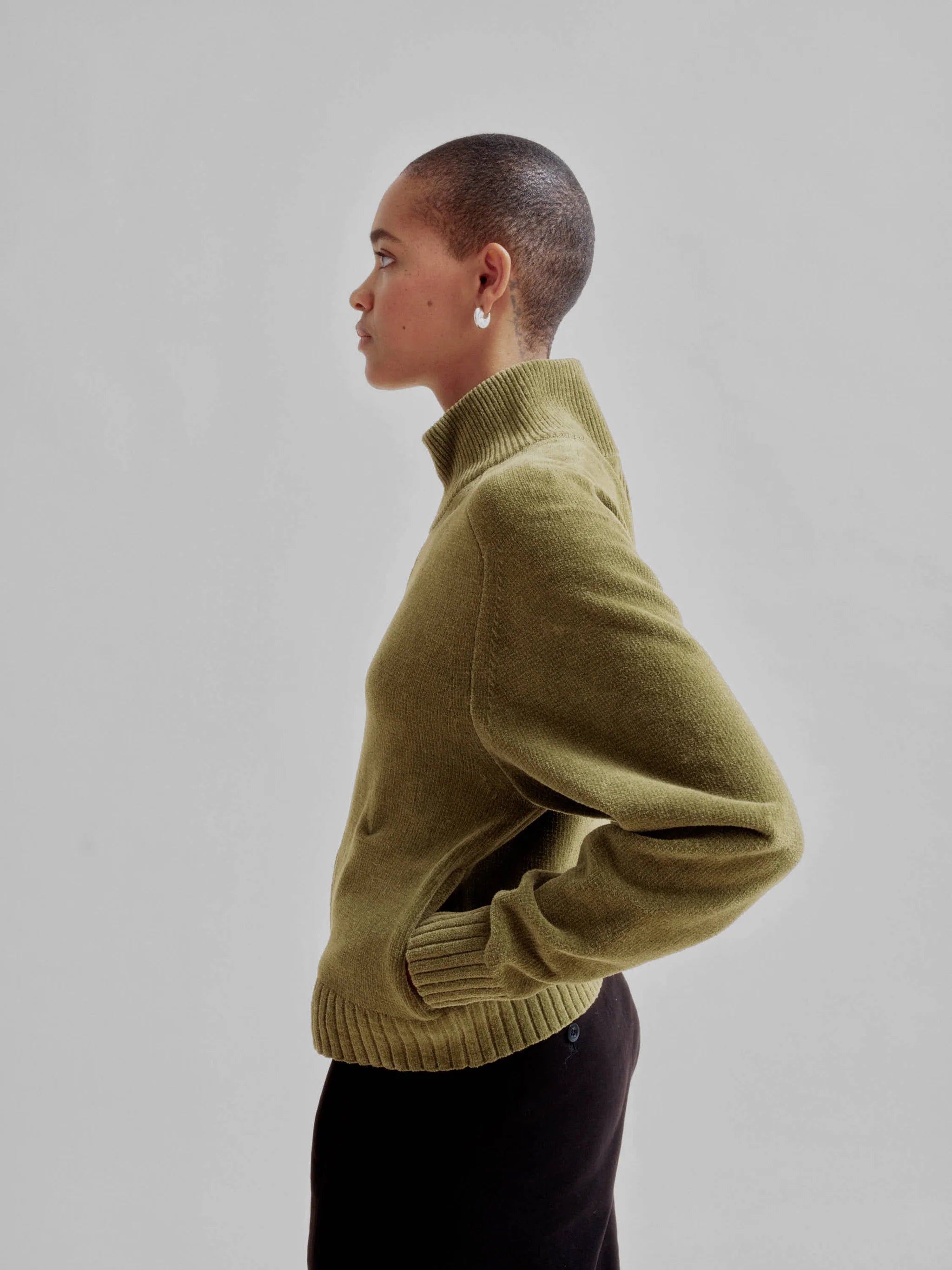 A compact-bodied mohair yarn high collar zip-up jacket. Made with organic cotton mohair yarn, it features a soft touch and a subtle sheen. With practical side pockets, this piece is perfect for the autumn season. Its minimalist yet striking design pairs effortlessly with denim, skirts, or trousers, making it a versatile addition to your wardrobe.