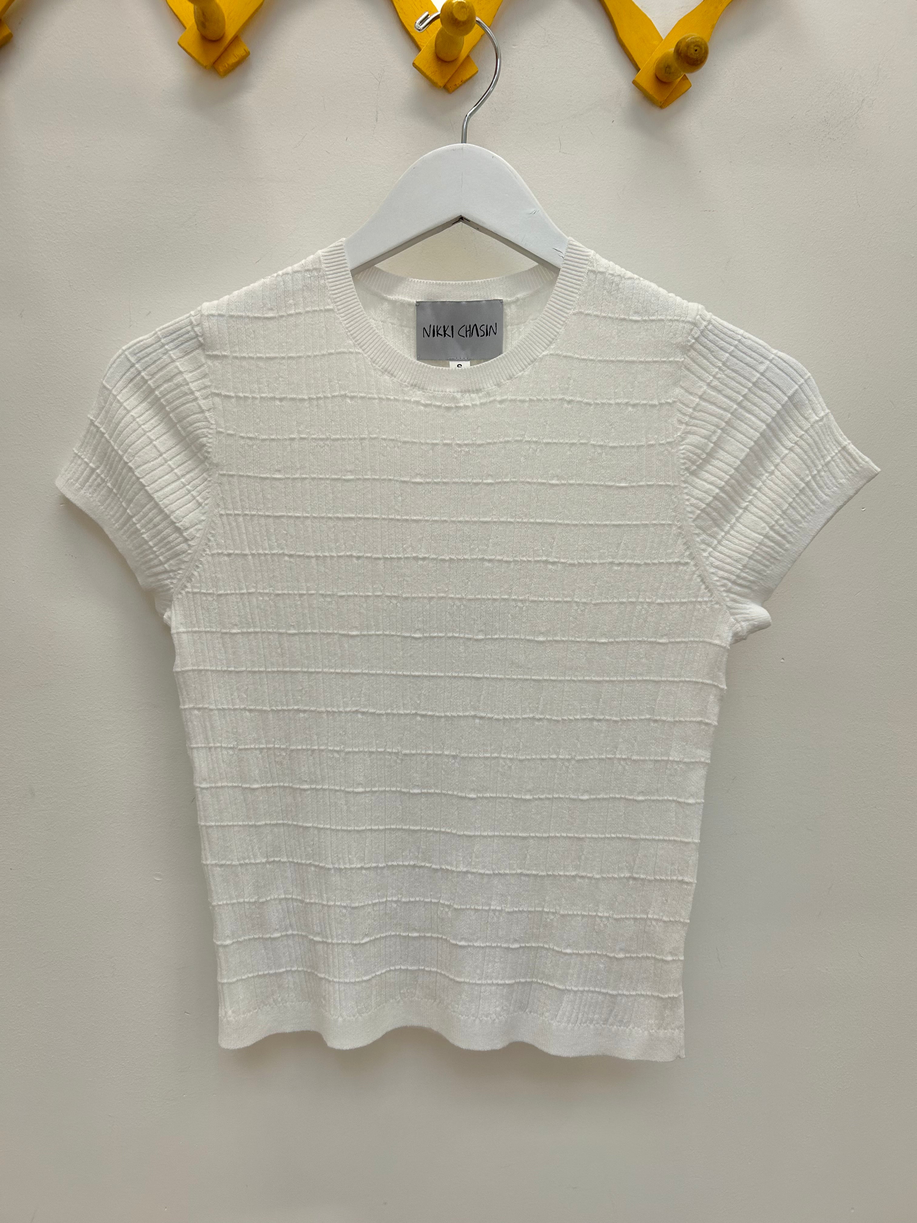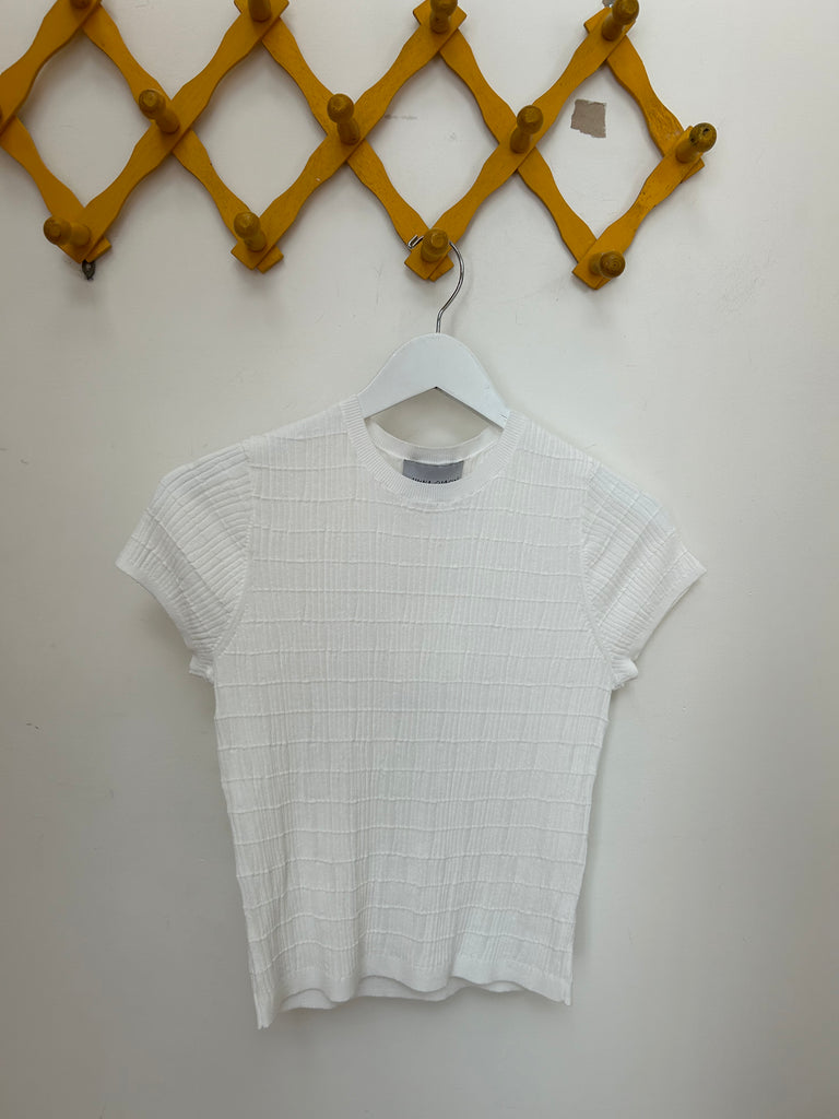 A fancy t-shirt? The Knit Rita T-Shirt is the elevated basic you didn’t know you needed, but magically works with everything. Made of a textured cotton (72%) and recycled nylon (28%) blend, this T makes life a little bit more elegant and pairs excellently with a party skirt.