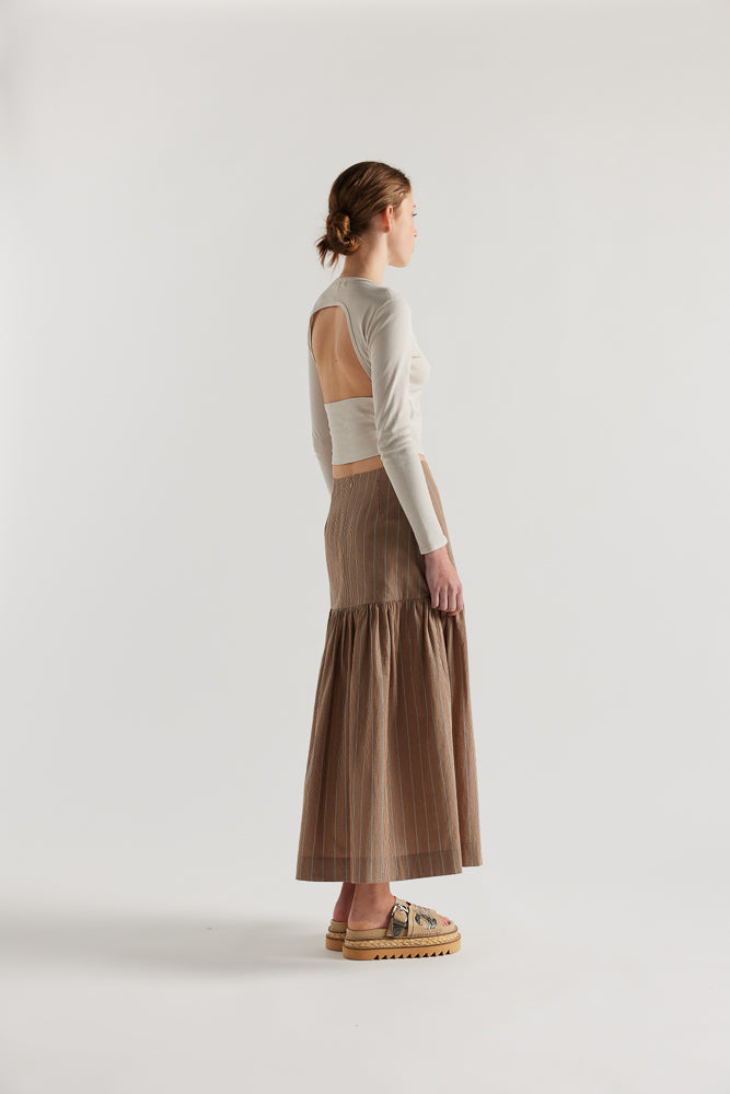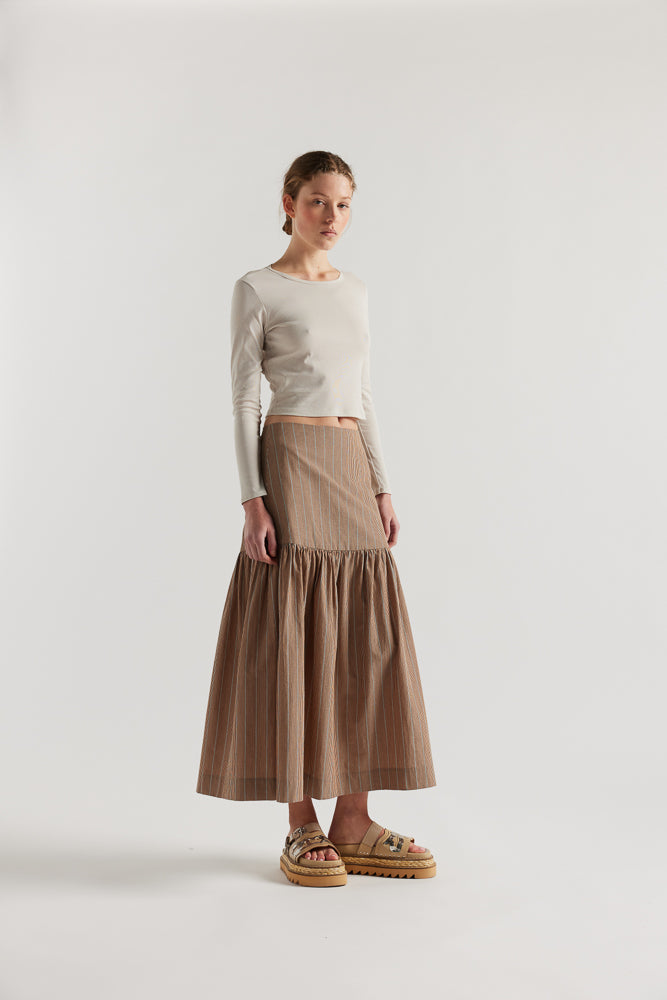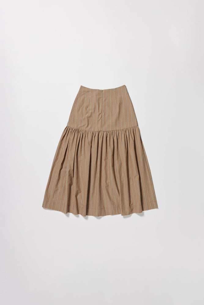 A thoughtfully designed gathered panelled skirt in this seasons lightweight stripe in yarn dyed cotton. The relaxed silhouette features a slim fitting wide yoke waistline which falls to below the hip with a gathered full skirt with elegant drape and movement. The wide yoke features back darts and invisible zip opening opening.