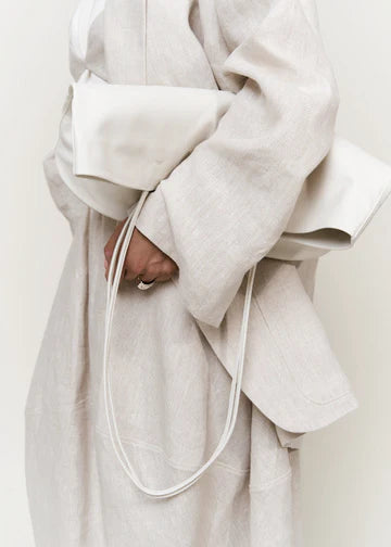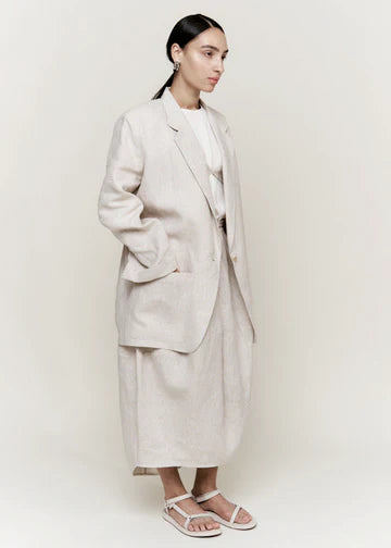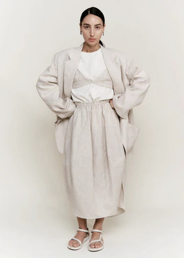 Balloon Skirt in Belgian Linen. Voluminous Shape with High Low hem detail. two Pockets, Zip Back and Elastic Waist.