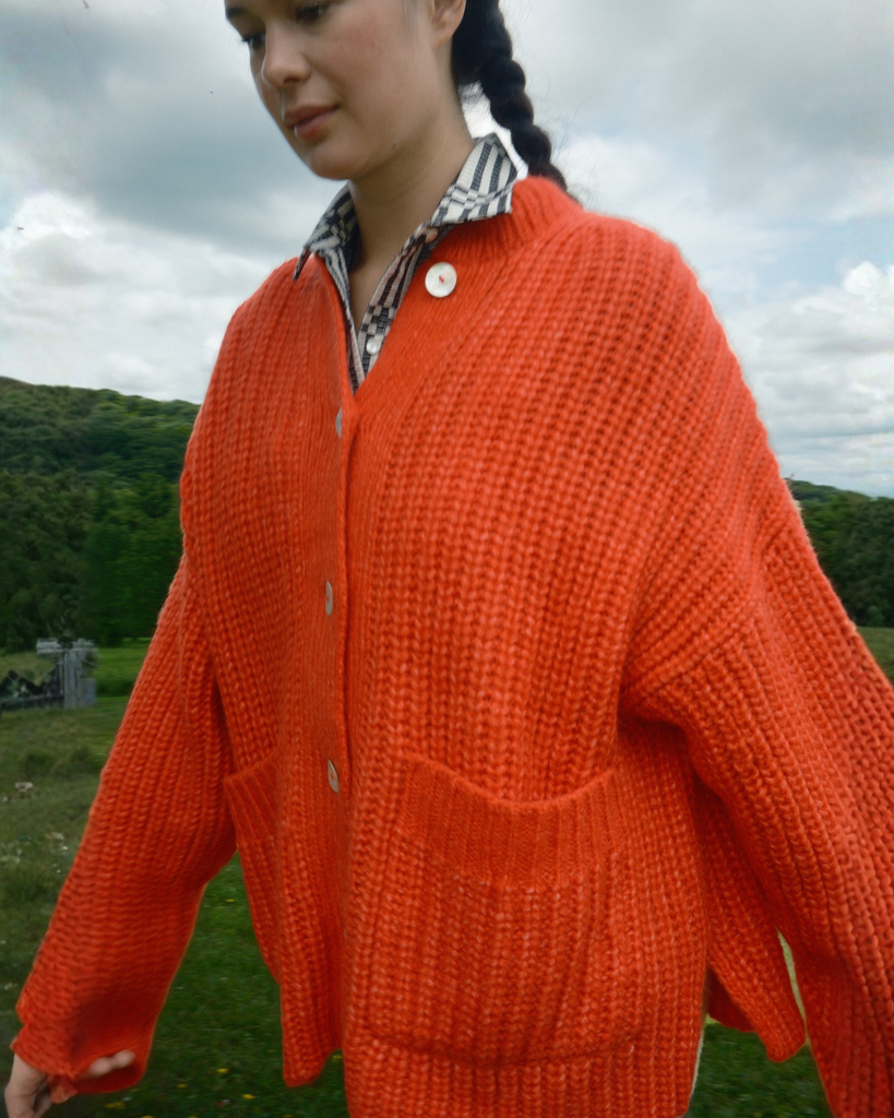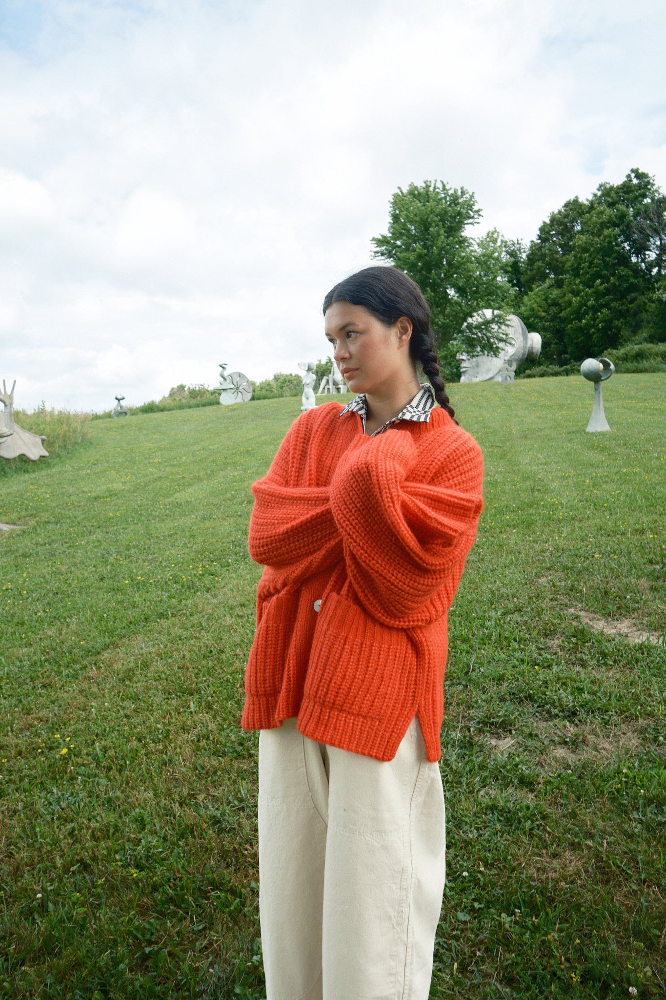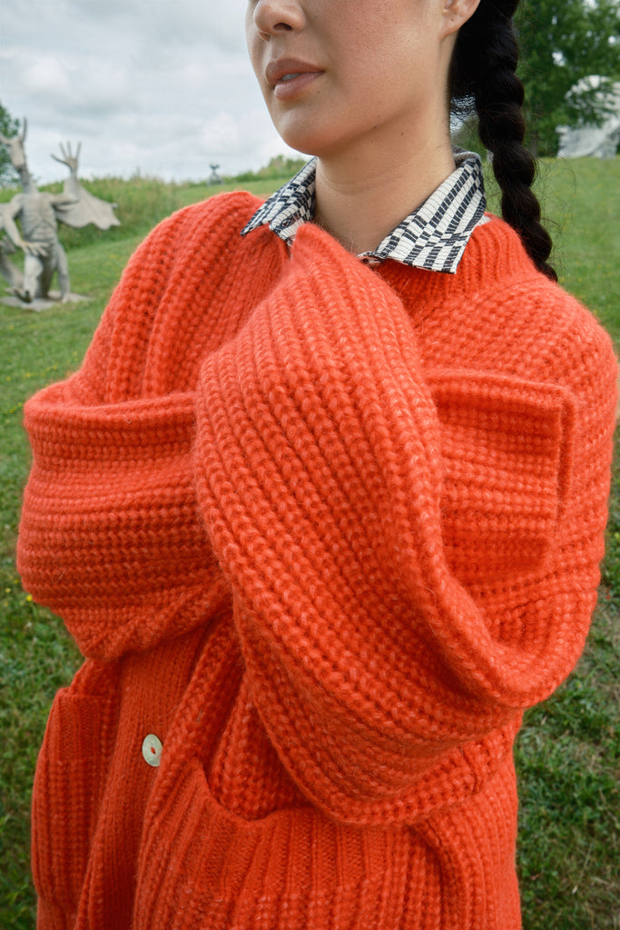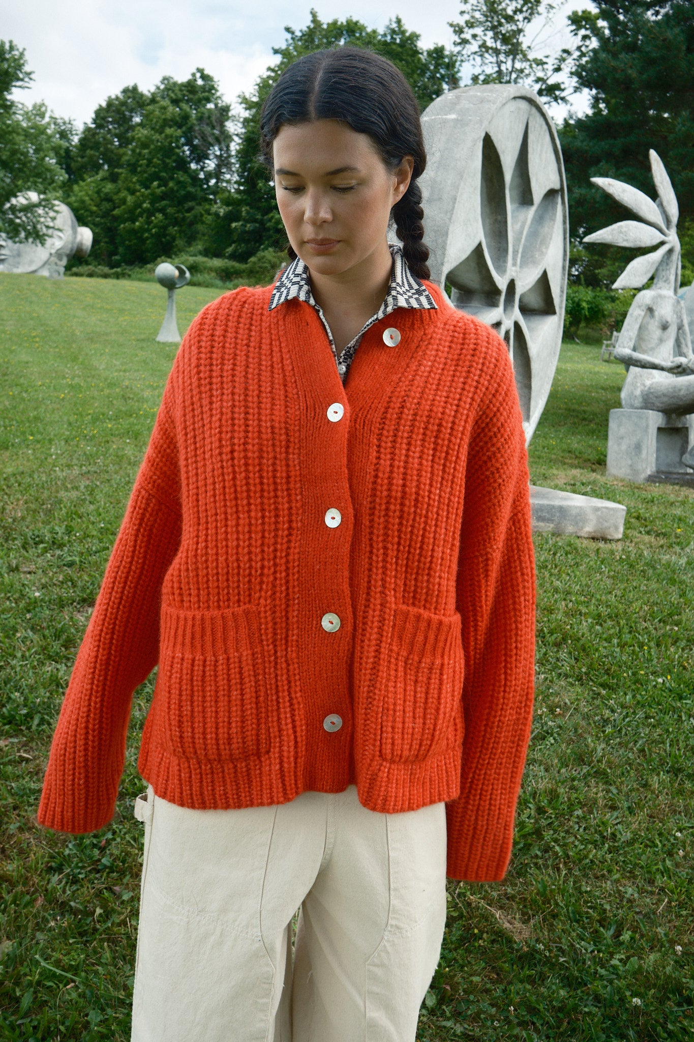 The Sybil Ribbed Cardigan is a big chunky blanket of a sweater, featuring oversized pockets (good for snacks) and our favorite shiny pearly buttons.