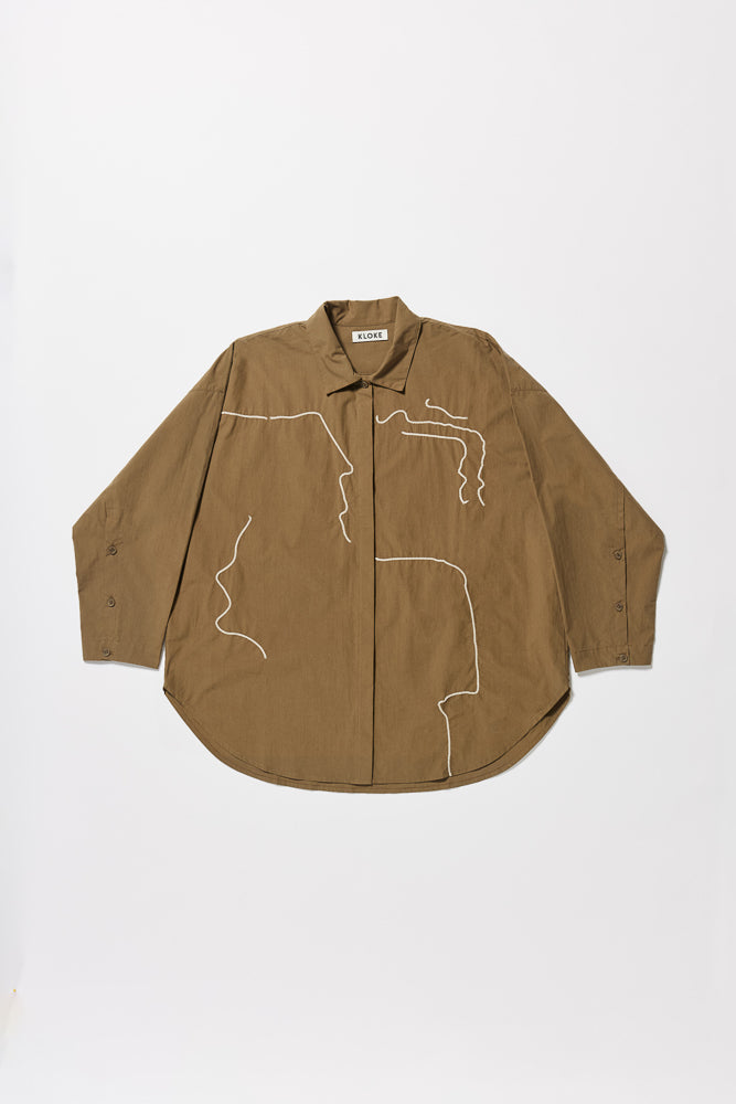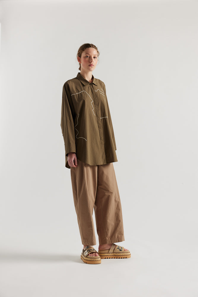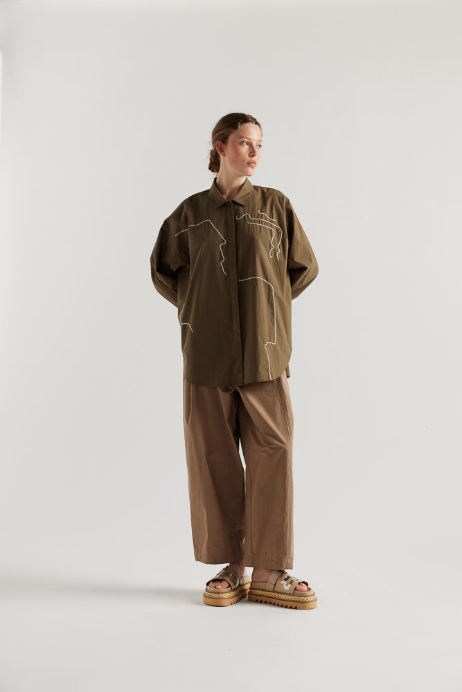 The Ache Embroidered Shirt hosts a built in collar and concealed centre front button placket. This long sleeve painters shirt style features embroidered motifs at the front while the back has been left plain. A dropped shoulder and deep back sleeve tuck with a three button closure towards the cuff. A relaxed boxy cut, styled to wear oversized.