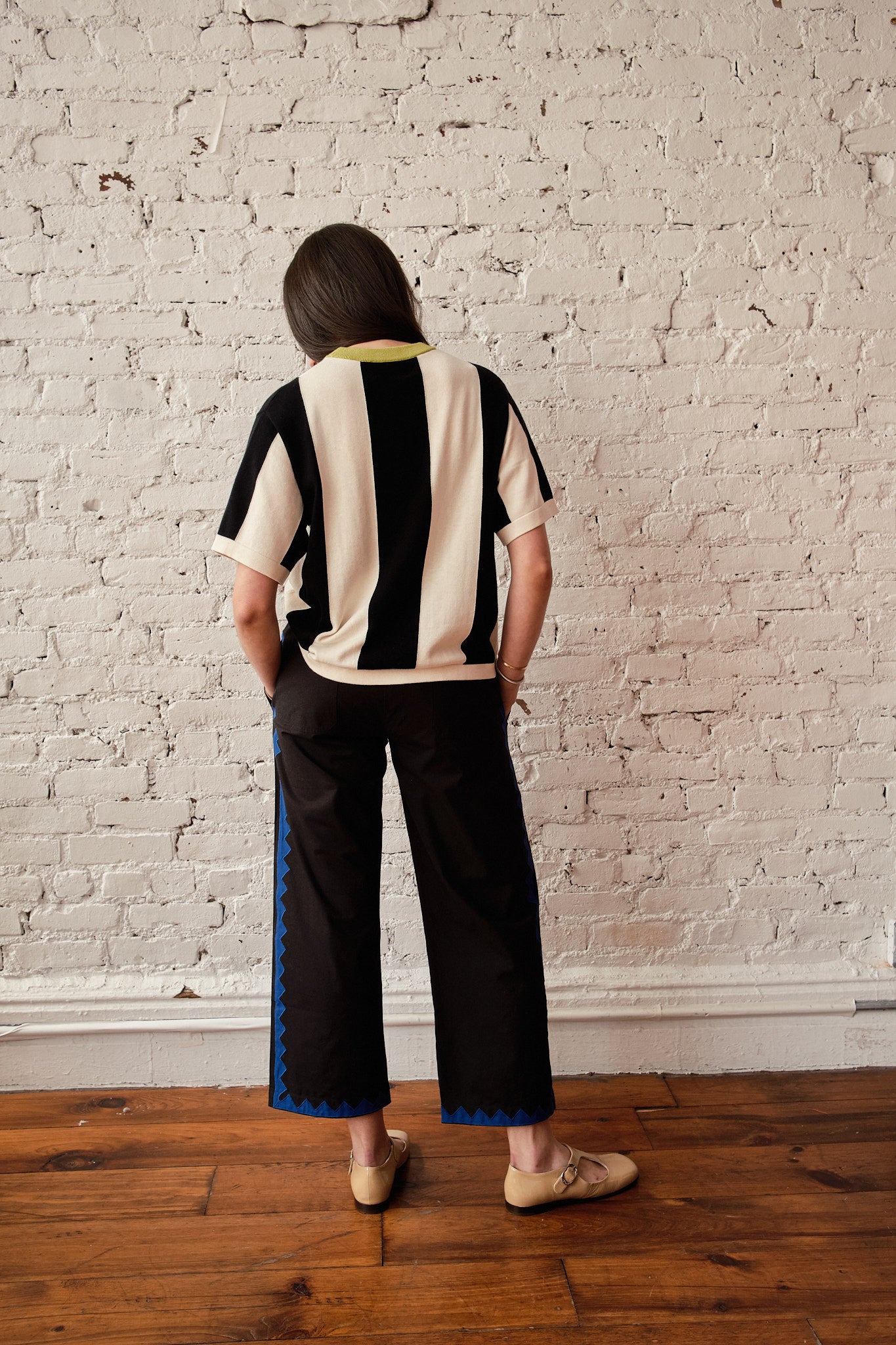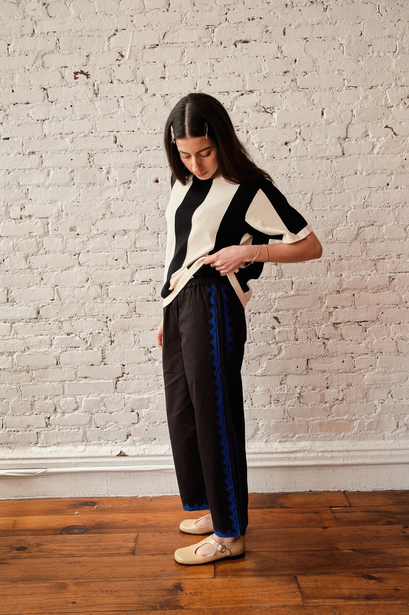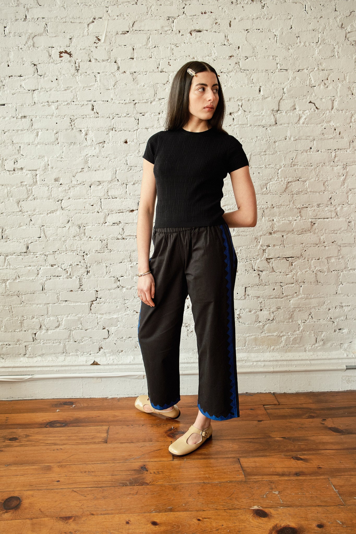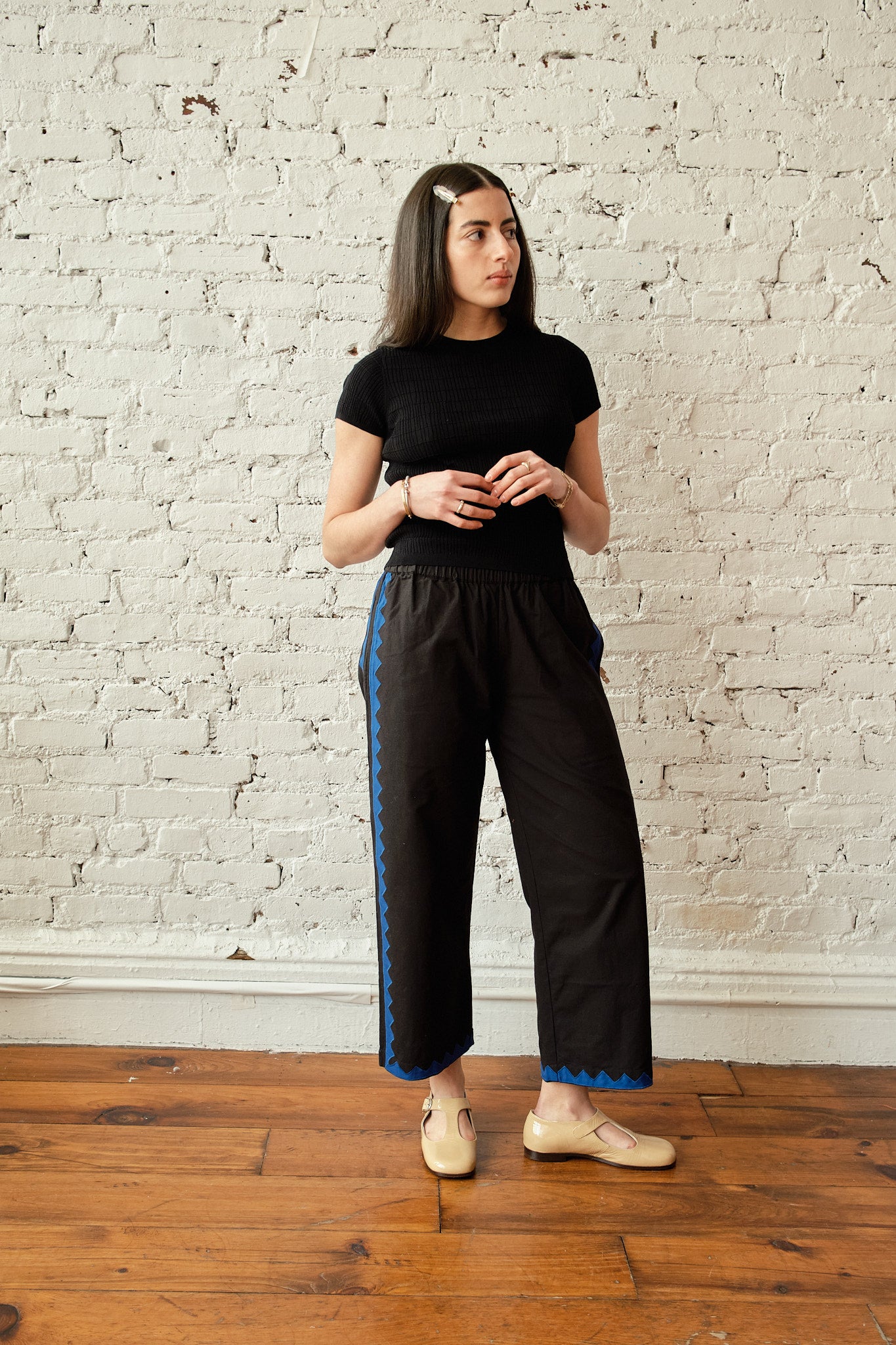 Cropped pant with elastic waist in a medium weight cotton with front and back patch pockets