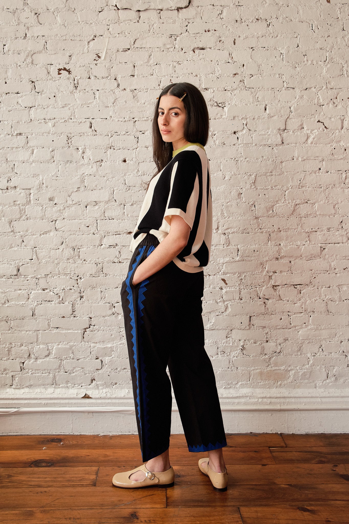 Design inspiration can come from many places at once. The triangular embroidery motif can be traced back to early 18th century quilting, when the popular pattern was called a “dogtooth border.”