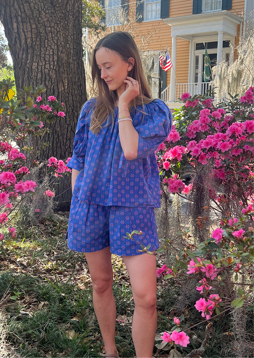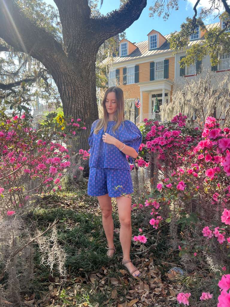 Nikki Chasin x The House That Lars Built Juli Puff Sleeve Top in Cobalt Karin Floral