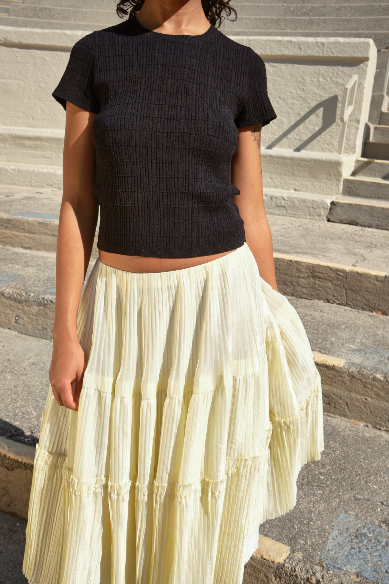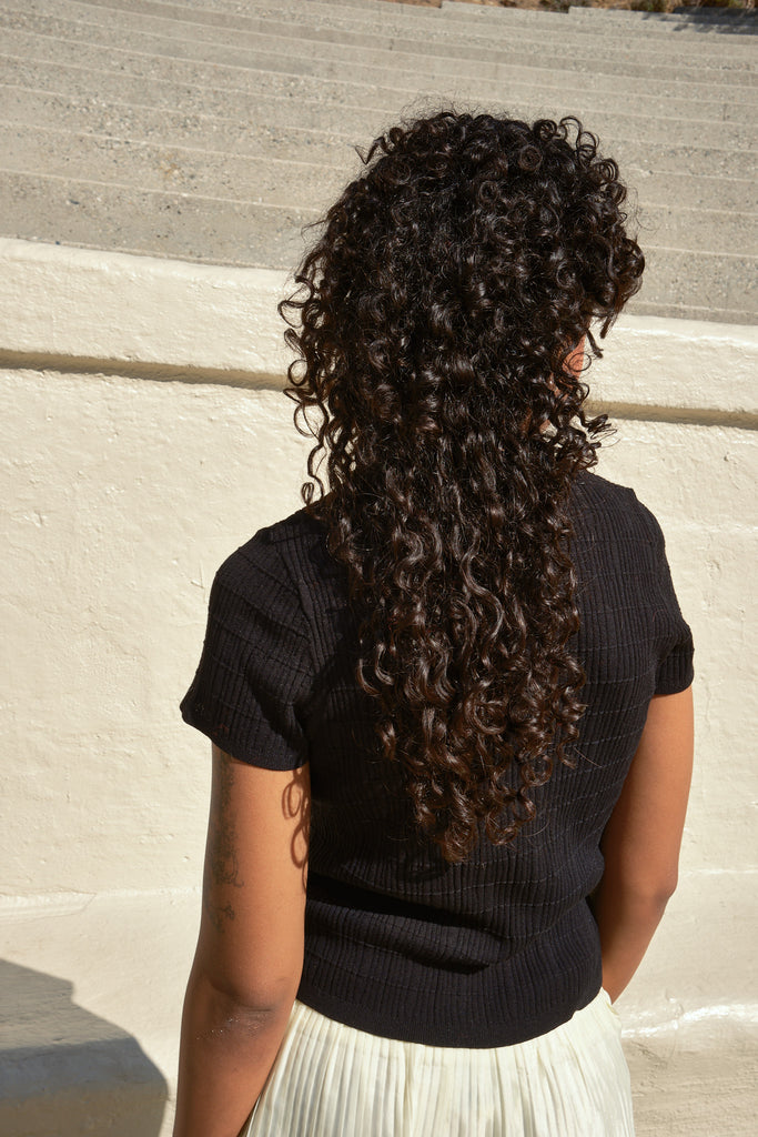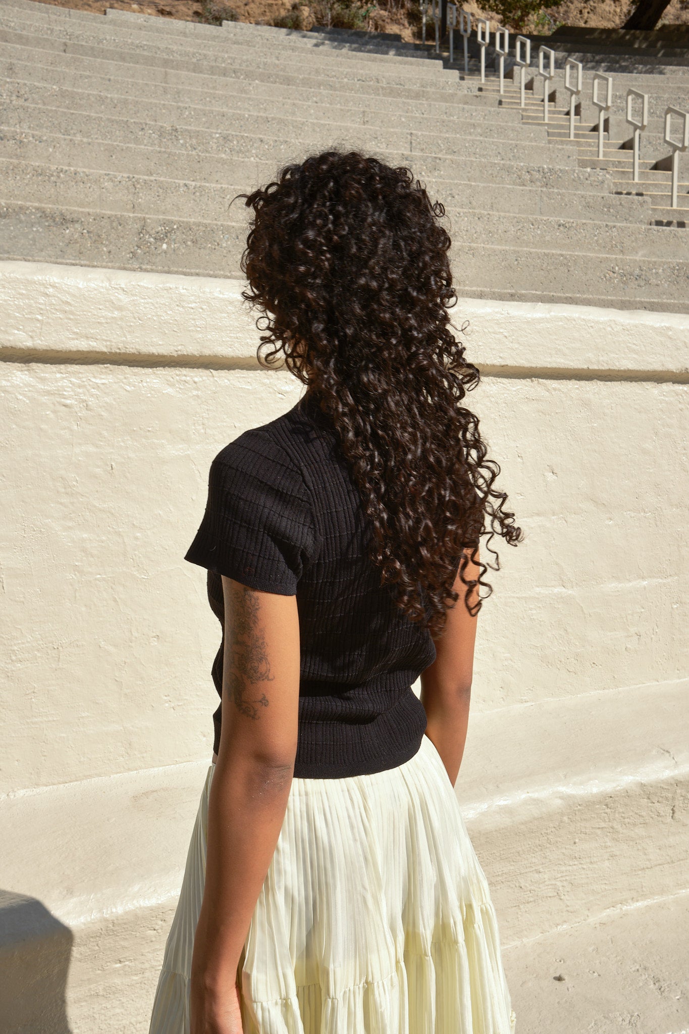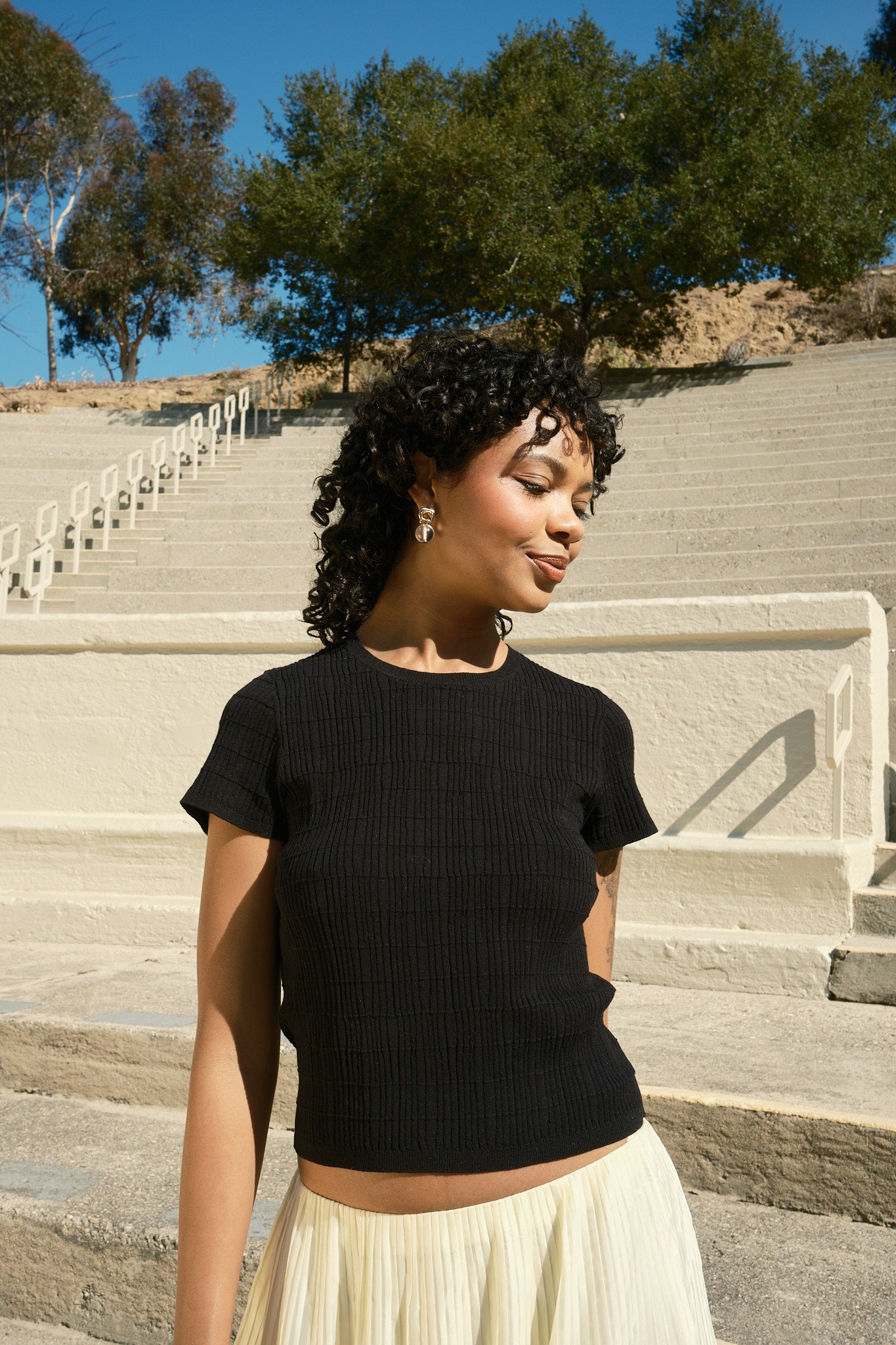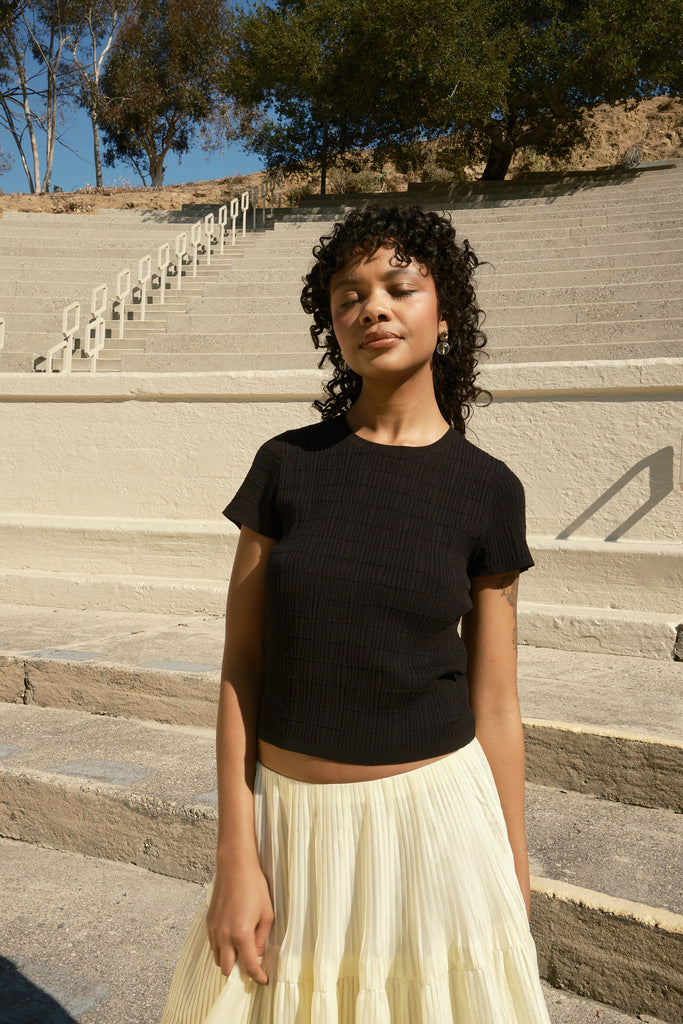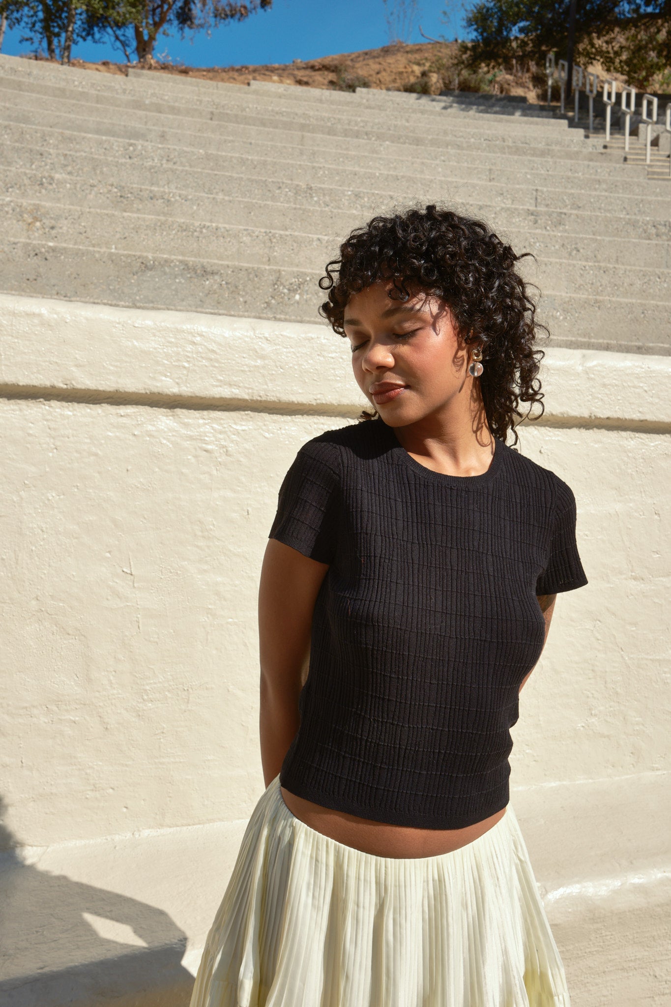 A fancy t-shirt? The Knit Rita T-Shirt is the elevated basic you didn’t know you needed, but magically works with everything.  Made of a textured cotton (72%) and recycled nylon (28%) blend, this T makes life a little bit more elegant and pairs excellently with a party skirt.