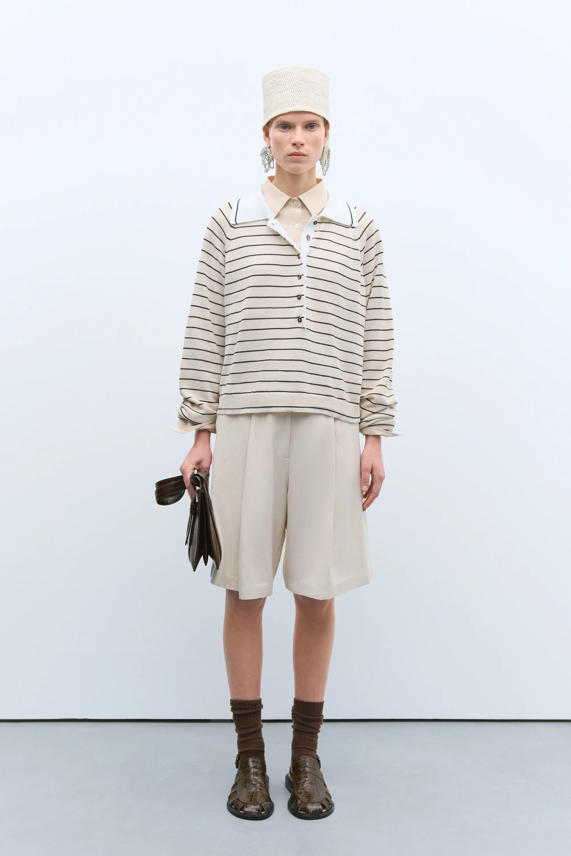 A stylish oversized polo with a classic buttoned polo collar. Features brown stripes on an ecru background, accented with a contrasting white collar and black stripe detail that matches the striped cuffs. Small side buttons add a charming touch to this versatile piece, perfect for relaxed yet polished outfits.