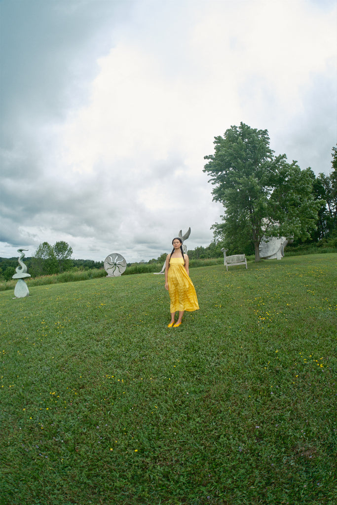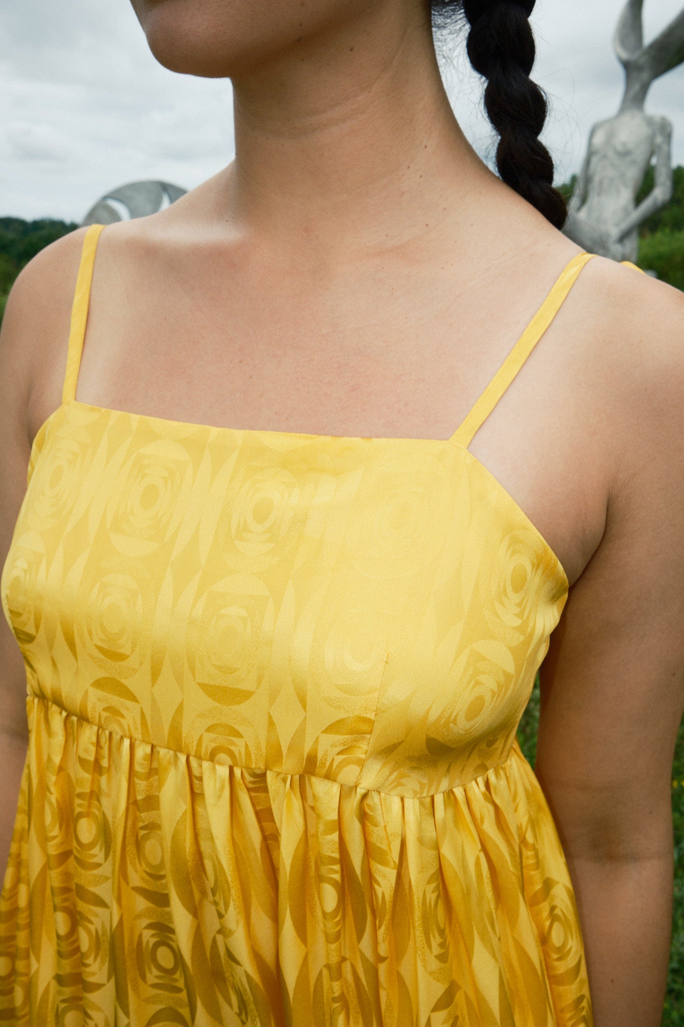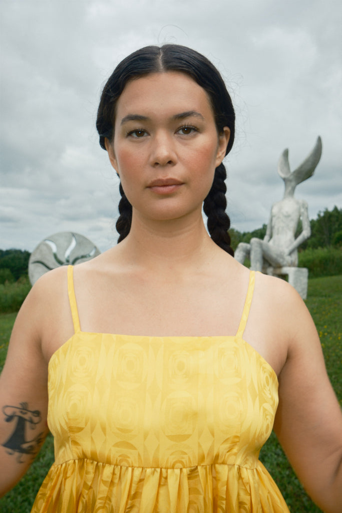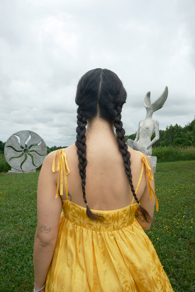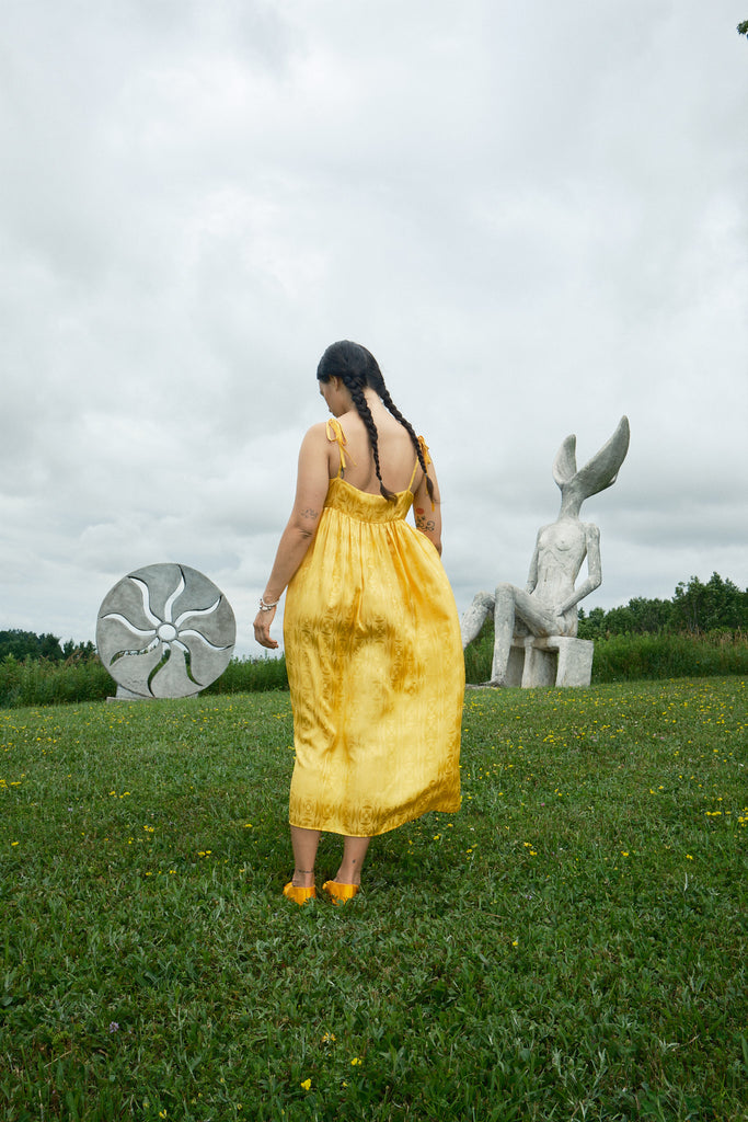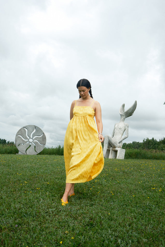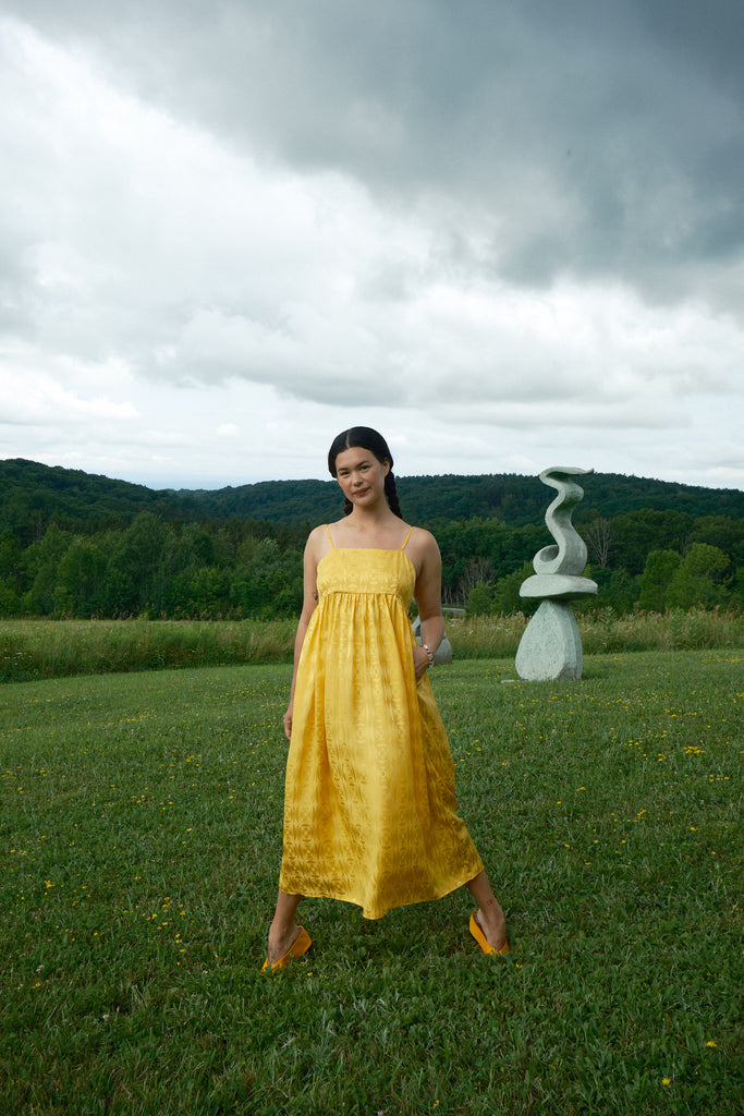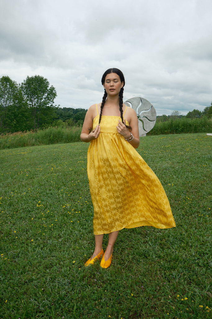 Just in time for wedding season, the Seraphina Tank Dress is ready to party. Made of 100% silk crepe de chine with a tonal optical illusion pattern, this dress has a subtle elegance that makes you look twice. It comes in both marigold yellow and white, so we have both chic wedding guests and casual brides covered. Fitting true to size with adjustable straps, the length should hit around the calf to ankle depending on your preference and height. To level up the fun (if possible) we suggest pairing it with jellies or the Satin Theater Shoe.