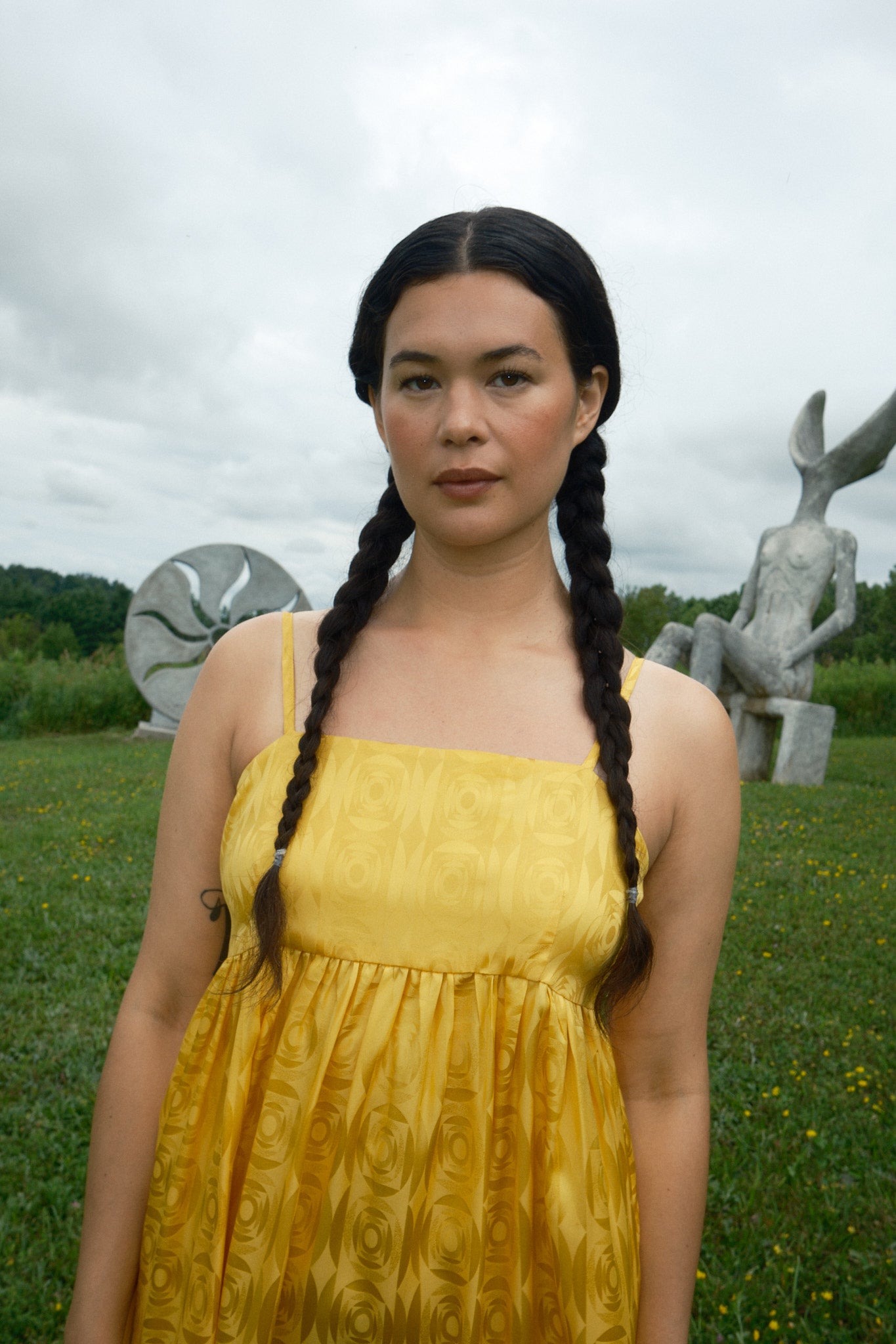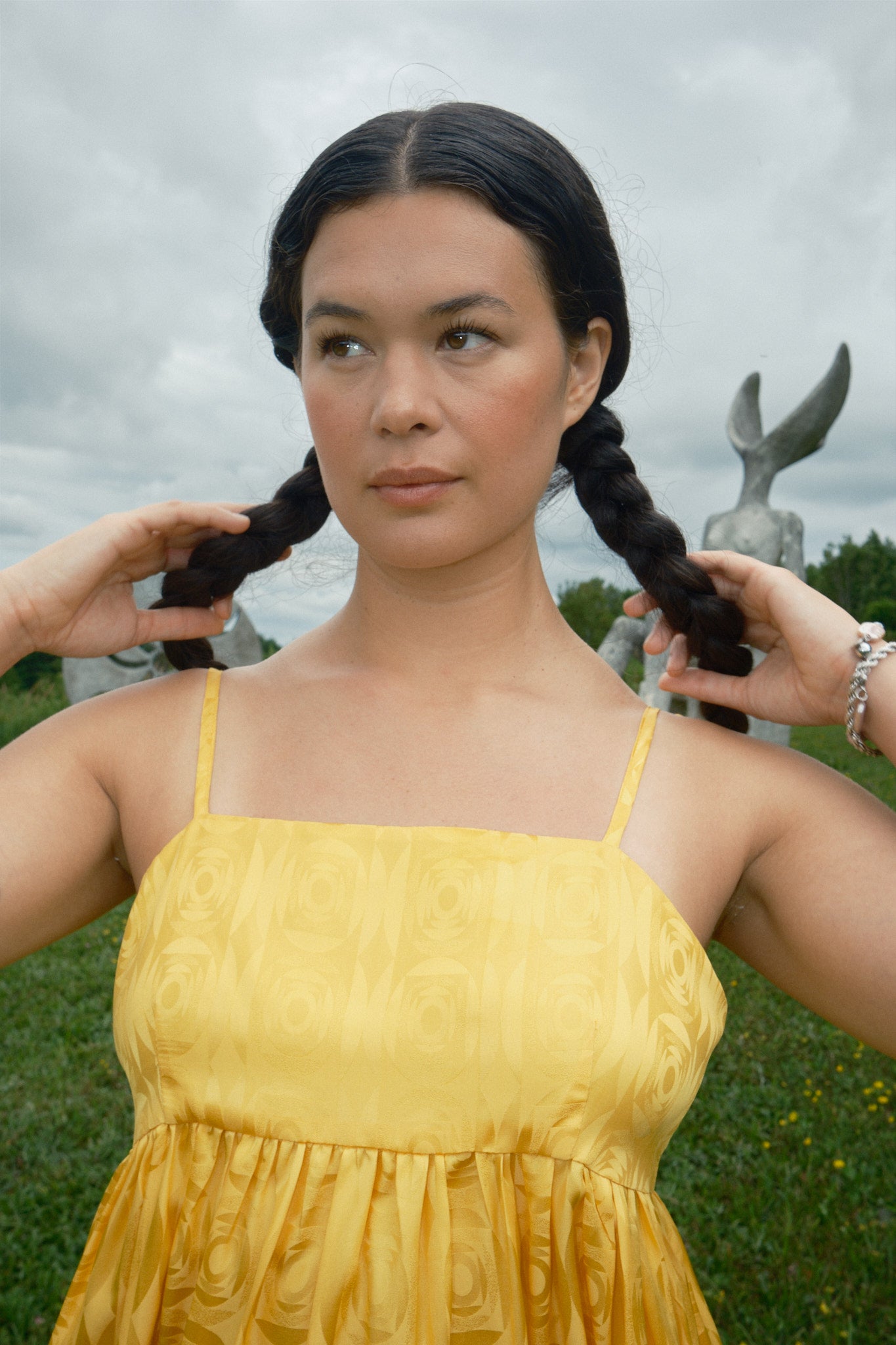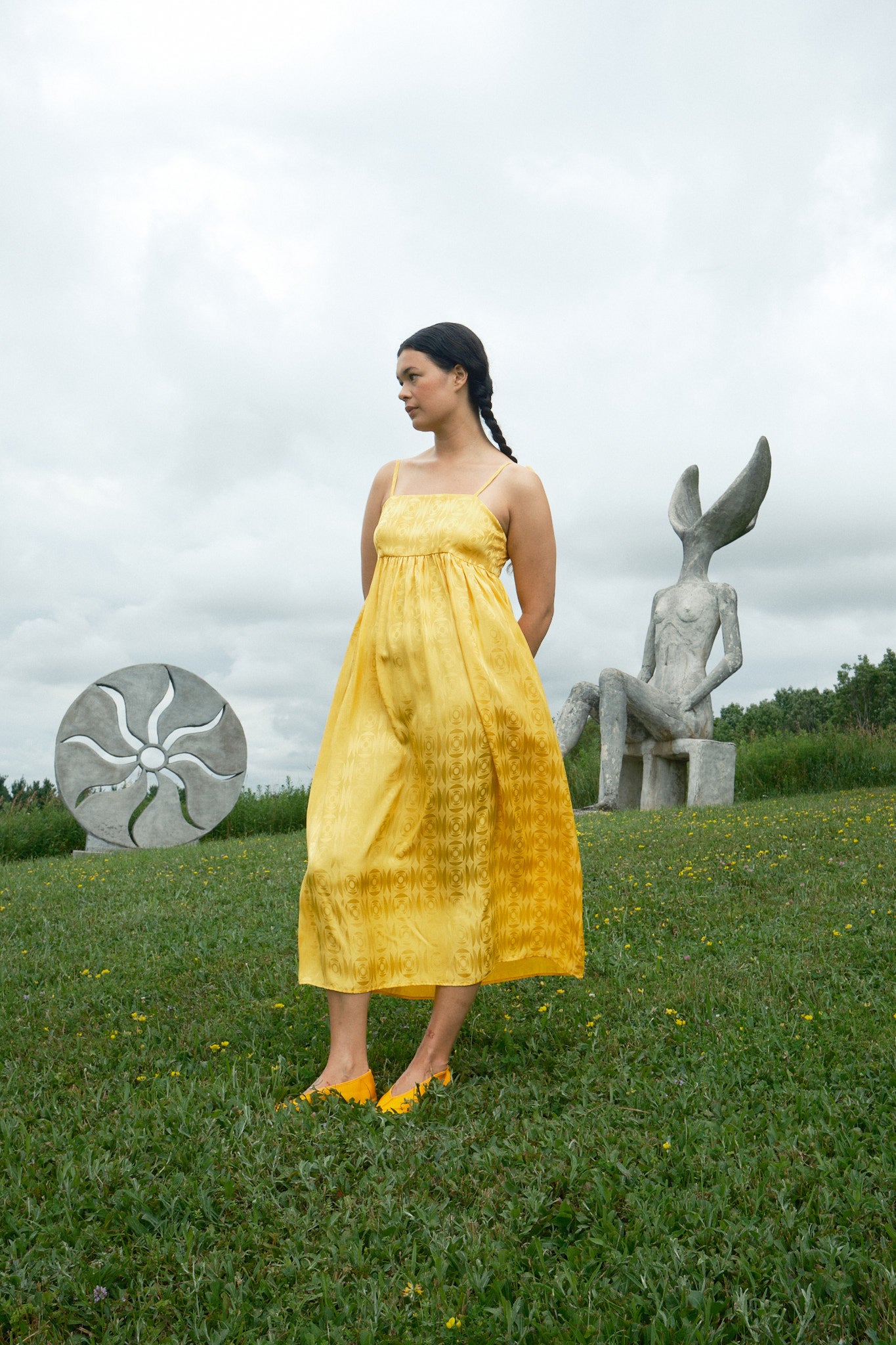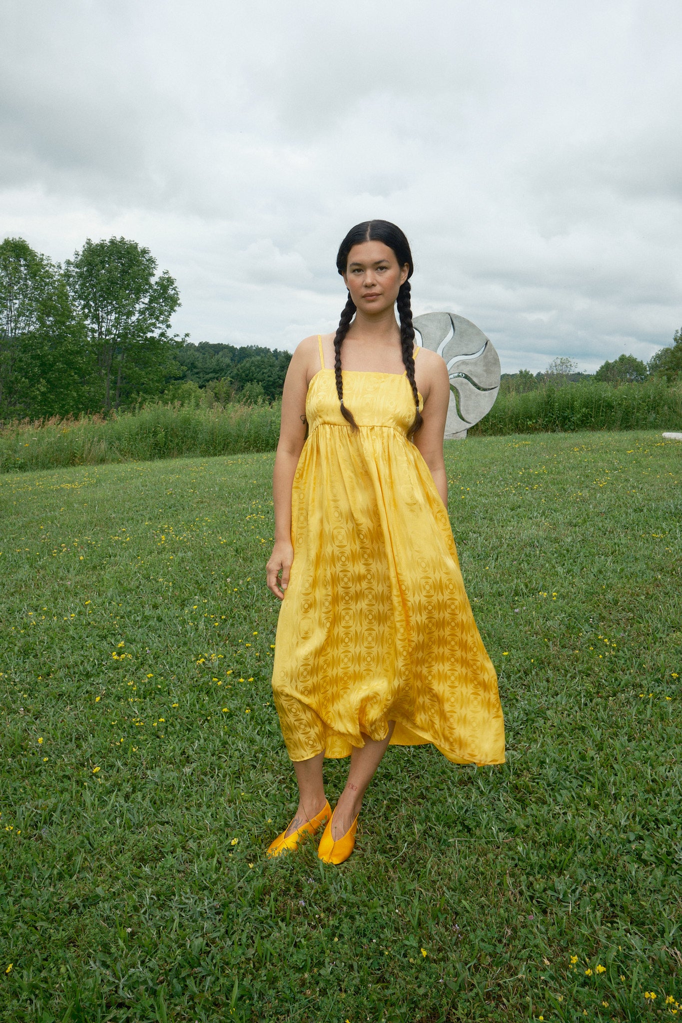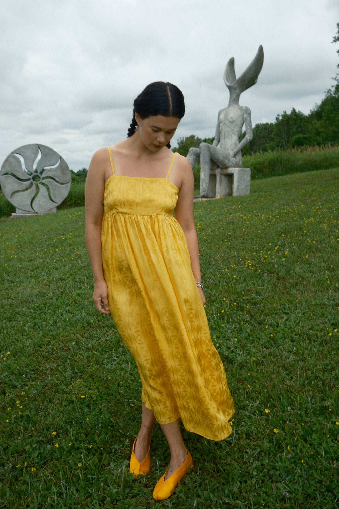 Just in time for wedding season, the Seraphina Tank Dress is ready to party. Made of 100% silk crepe de chine with a tonal optical illusion pattern, this dress has a subtle elegance that makes you look twice. It comes in both marigold yellow and white, so we have both chic wedding guests and casual brides covered. Fitting true to size with adjustable straps, the length should hit around the calf to ankle depending on your preference and height. To level up the fun (if possible) we suggest pairing it with jellies or the Satin Theater Shoe.